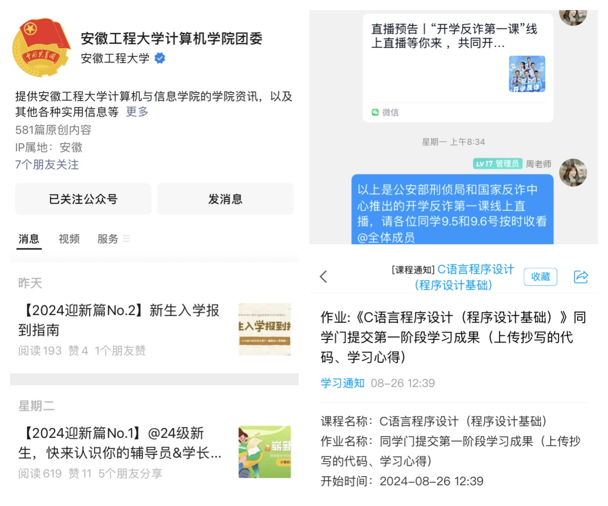 打造“线上”校园,前置入学教育。利用官微等新媒体平台及时推送新生数据大揭秘、新生入学指南、迎新小贴士、安全教育、防诈教育等多期推文,帮助学生提前建立专业QQ群,搭建新生与学院、辅导员互动交流的平台,实现精准对接。对新生开展 “前置教育”,专业教师借助“学习通”等网络学习平台,指导新生提前学习专业基础知识。