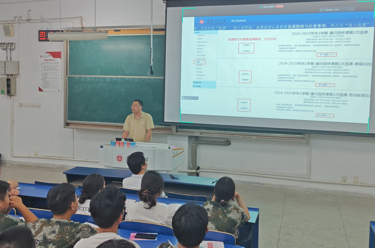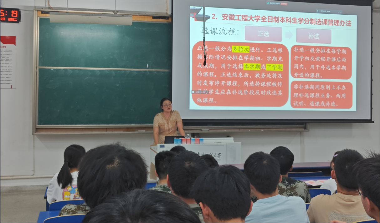 同时,为了帮助新生更好的了解学分制选课,数字素养与技能中心主任汪婧对学校关于学分制选课的具体方案和实施细则进行了介绍,教务员韩少杰老师对选课系统进行了细致地演示,为新生提供了针对性地选课指导。
