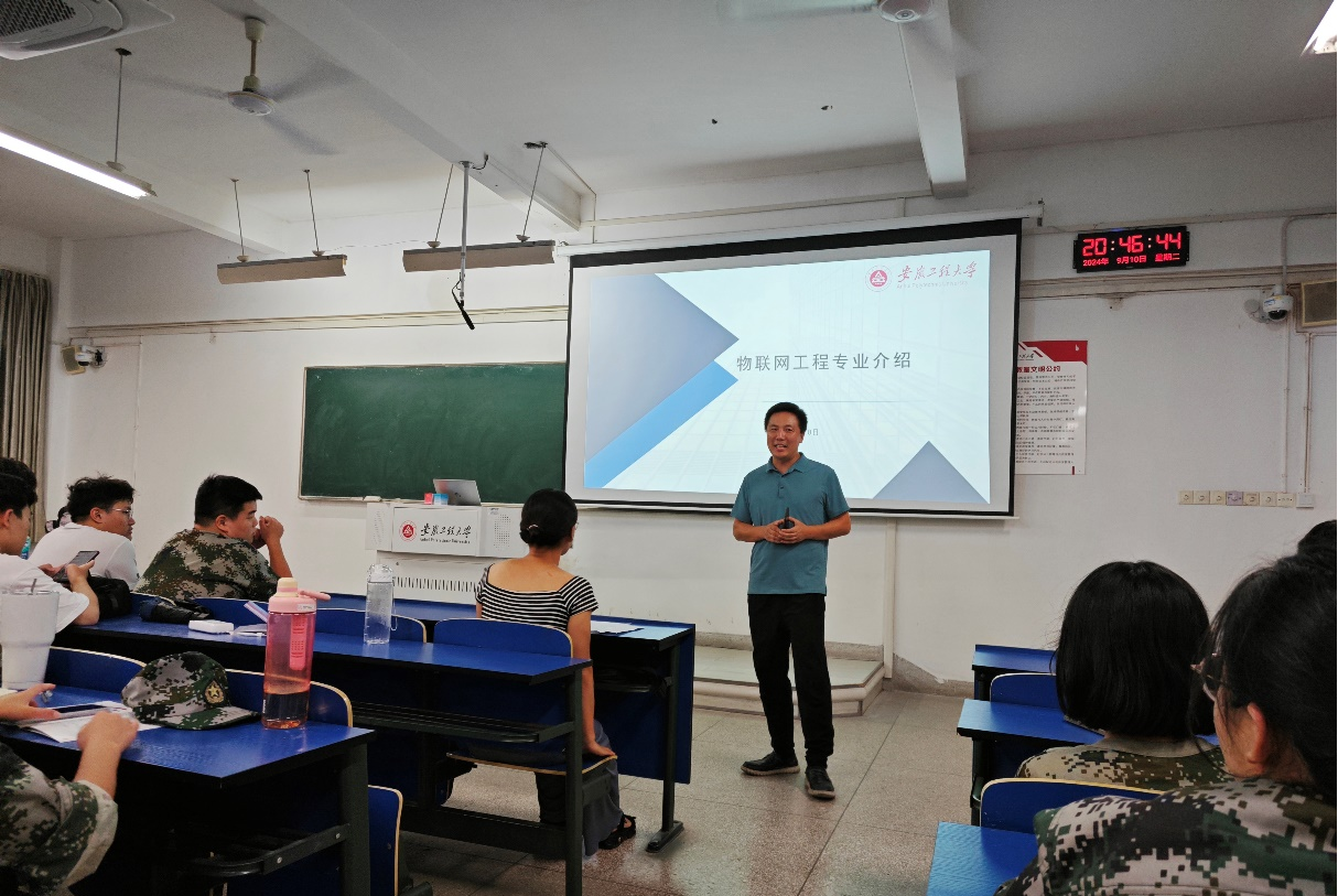 物联网工程专业入学教育分会场由物联网工程系副主任包象琳主持,系主任章平为新生们带来物联网工程专业介绍,深入浅出地介绍了什么是物联网,结合物联网工程专业办学成果,他详细介绍了专业办学历程、师资队伍、校企合作办学、产教融合课程建设。他强调了依托物联网协会及工业互联网现代产业学院企业冠名班的个性化人才培养模式,展示了优秀毕业生的风采、校企合作参赛的丰硕成果、以及软硬件资源的雄厚实力。章平老师还结合培养方案,为新生们进行了专业规划及选课指导,确保每位学生都能在物联网领域找到自己的定位和发展方向。