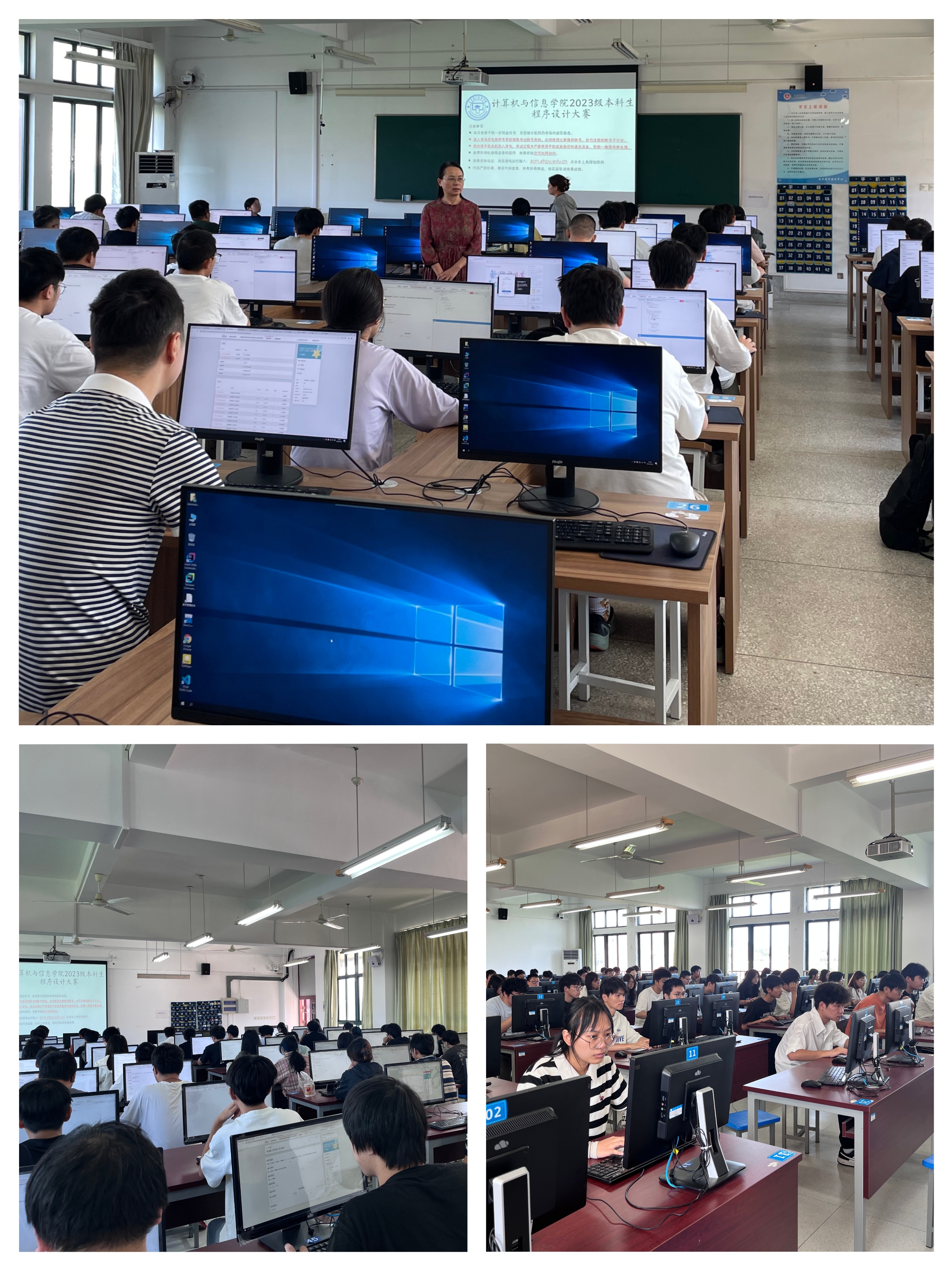 比赛在5号教学楼机房举行,共设有7个比赛机房,全部2023级本科生导师担任监考教师。现代教育技术中心在比赛场地、比赛环境上给予了大力支持。计算机协会组织了19名志愿者协助比赛组织工作。