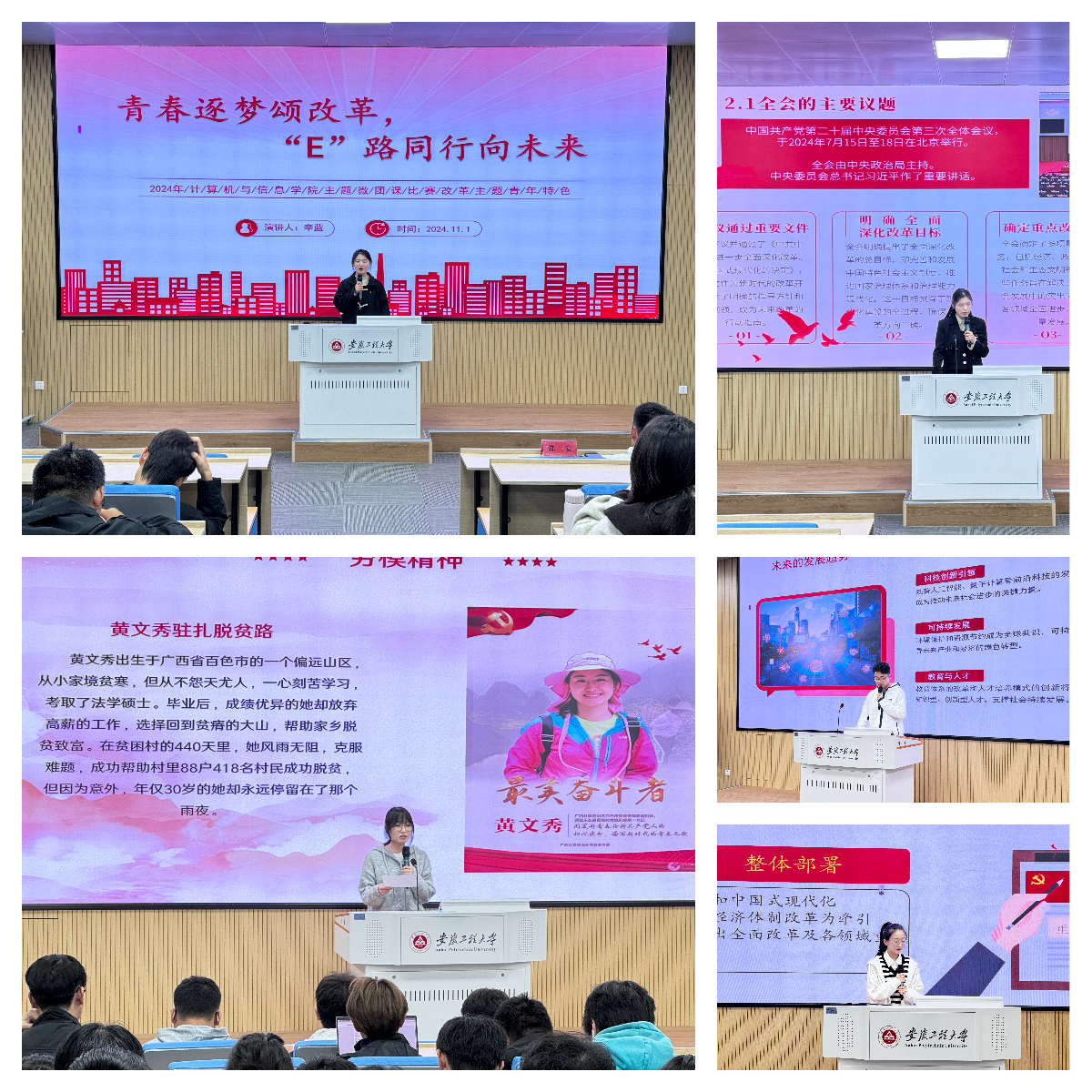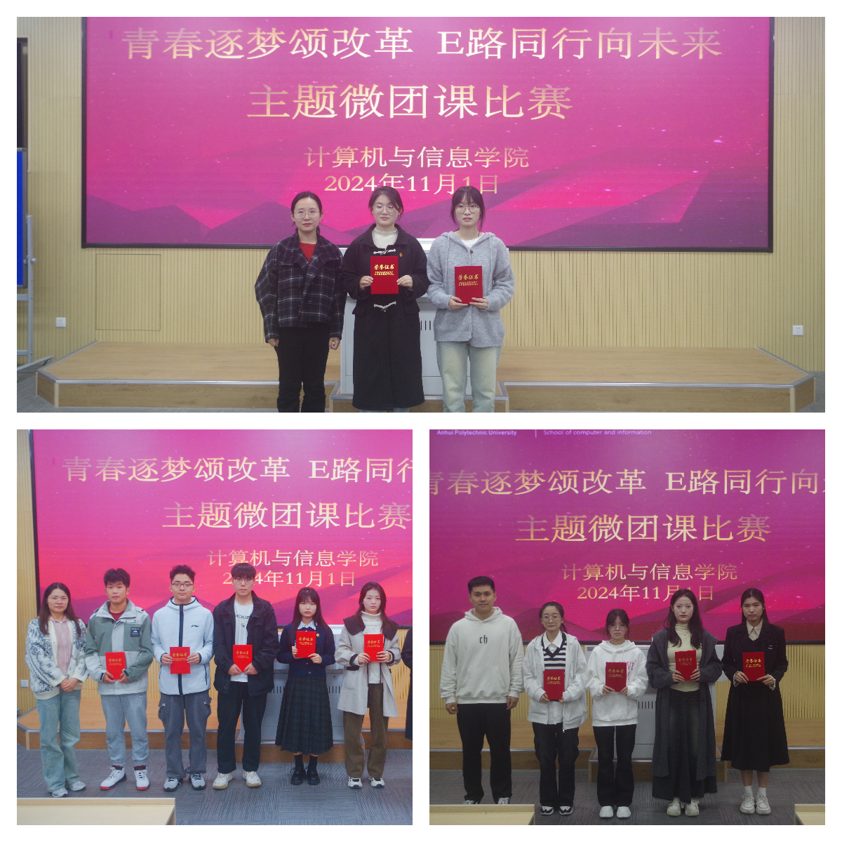 青春逐梦颂改革,“E”路同行向未来,为深入学习贯彻党的二十届三中全会精神,引领广大团员和青年深学细悟笃行党的创新理论,积极落实学校“三全六专”育人实践,11月1日,计算机与信息学院在5教217举办主题微团课比赛。校团委孙琳瑶、辅导员陈安、学院党政办公室周芳婷担任评委。
