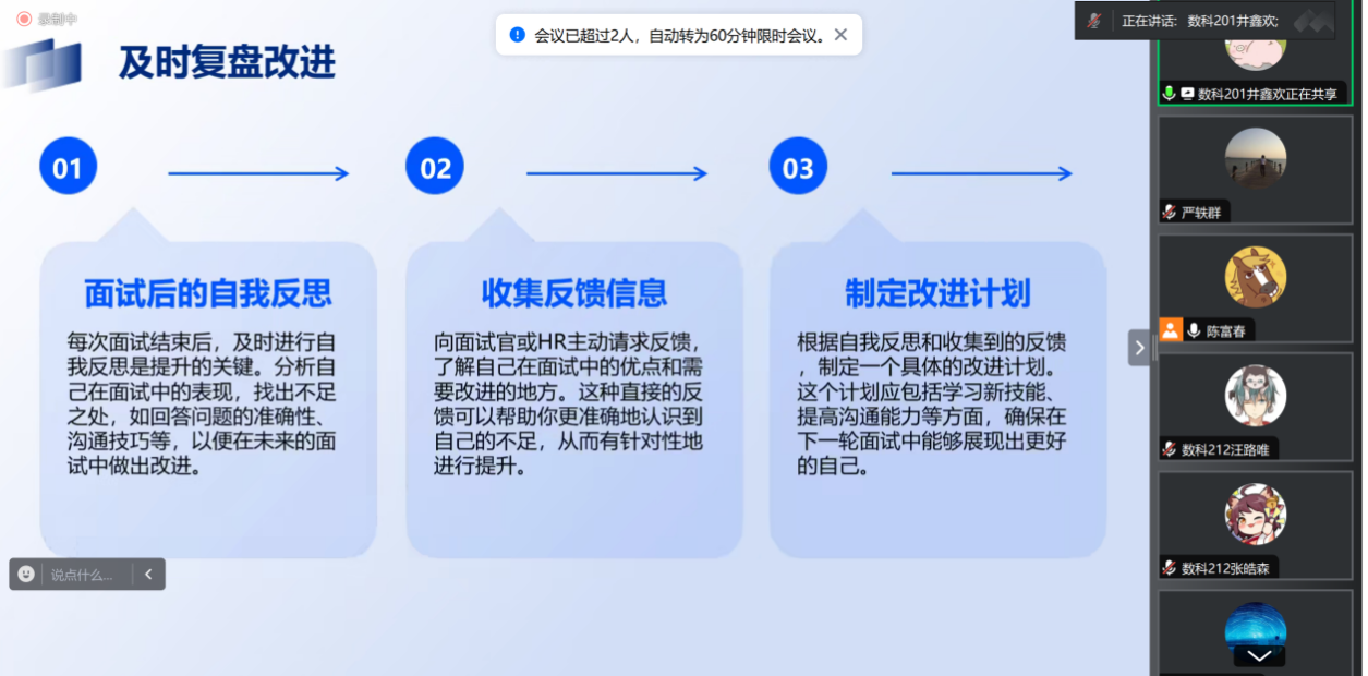 为帮助大四学生提前了解就业市场,提升求职技能,11月16日下午,数据科学与工程系邀请我系数据科学与大数据专业2020级毕业生井鑫欢同学与21级学生进行了就业与面试方面的线上经验交流活动。