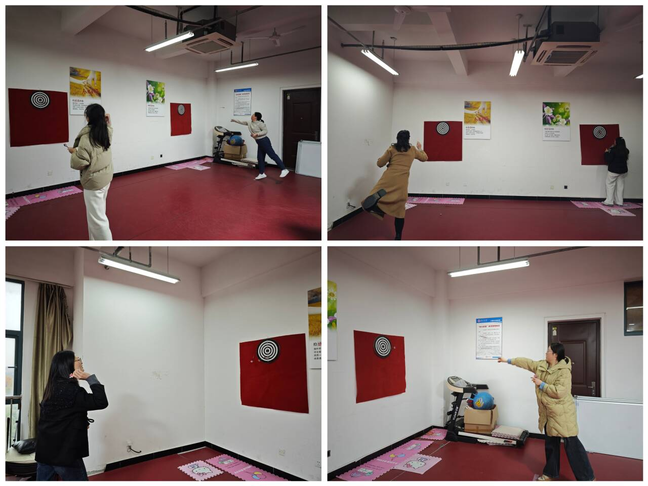 比赛中,老师们各个精神抖擞,沉着应战,动作干净利落、一气呵成。大家屏气凝神,对准靶心,手腕一转,飞镖犹如离弦的箭飞了出去,有的一发即中,赢来大家阵阵掌声与叫好声;有的虽屡屡失手,但依然毫不气馁、迎头再战。比赛现场秩序井然、精彩热烈,老师们在享受运动带来快乐的同时,也增进了彼此间的沟通和友谊。
