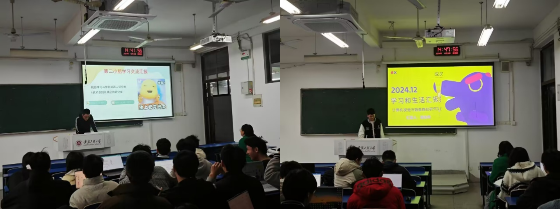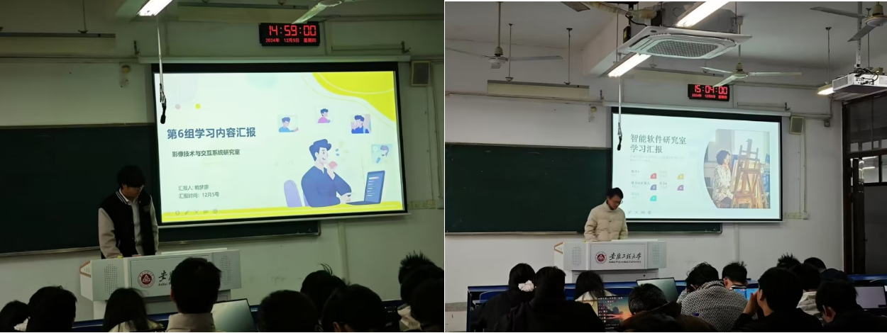 第三组:机器学习与智能机器人研究室和模式识别及其应用研究室的汇报人张宗燕在汇报时用可爱的动漫卡通人物营造一种轻松自在的分享环境;介绍两个研究室的人员,并分享了他们的学习成果;交流了准备四六级考试的经验,强调真题和平时单词积累的重要性;他们的团队交流取长补短、共同进步。