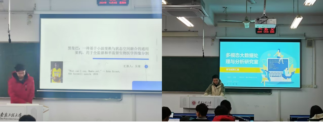 第七组:影像技术与交互系统研究室的汇报人鲍梦原则展示了各个成员分别在不同方面的学习进程,包括Vue技术与项目、数据分析与机器学习、数据库与电脑维护、ADN网络编码器修改、ADN网络编码器修改;展示了UNET模型概述、编码器和解码器结构、模型训练技术和预训的研究成果。汇报组的成员受益匪浅,同时也让其他的同学更好的去了解汇报组的学习内容。