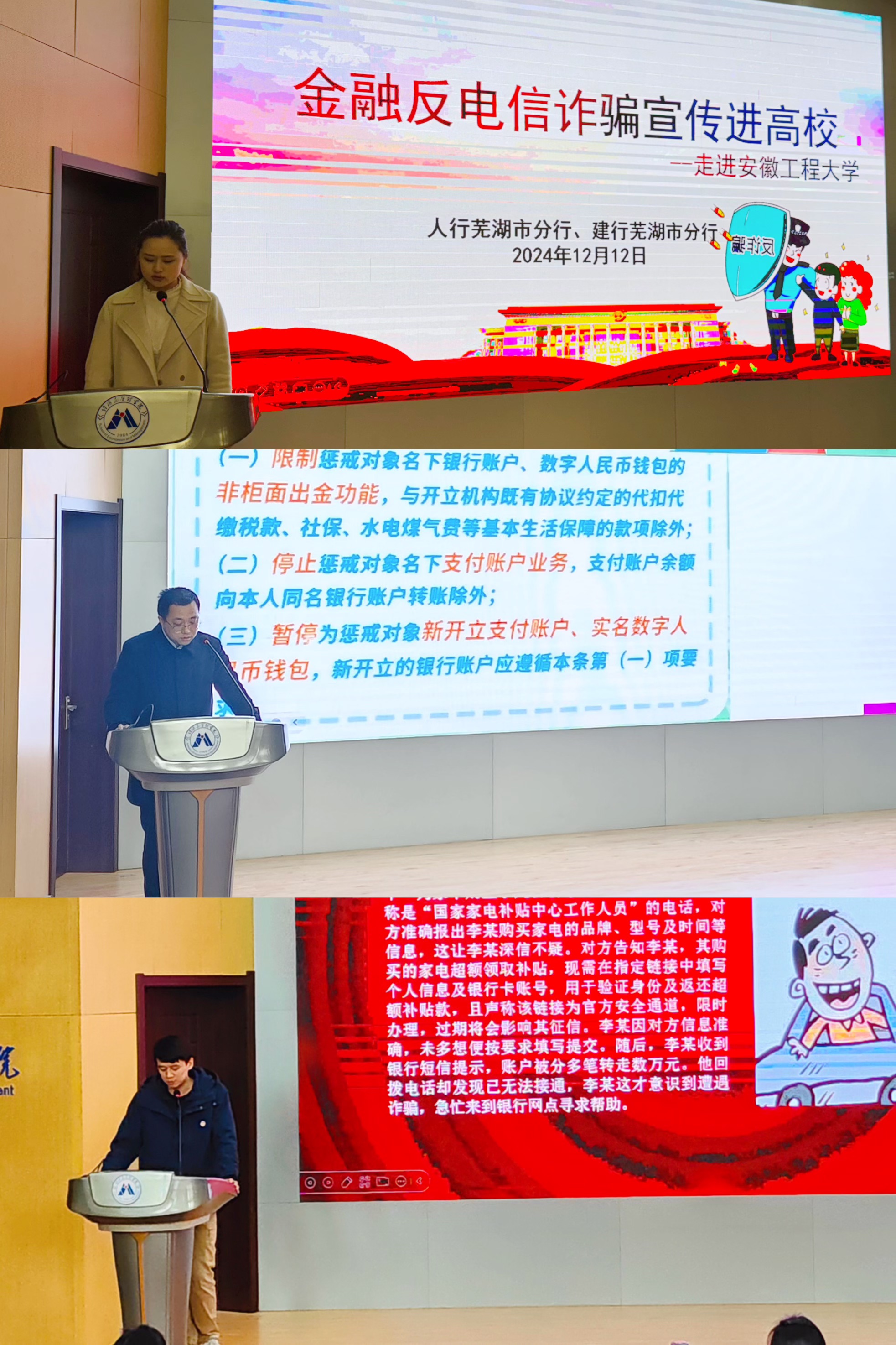 为提高大学生的金融风险防范意识,增强学生“识诈反诈”意识和能力,12月12日,计算机与信息学院与中国人民银行芜湖市分行、中国建设银行芜湖市分行联合开展“金融反诈宣传进高校”专题宣讲活动。人民银行芜湖市分行领导刘军、建设银行芜湖分行副行长汪庆、校保卫处处长文才新、校学生处处长黄炜、学院党委书记李卫东、党委副书记孙德茹,人民银行芜湖市分行、建设银行芜湖市分行相关负责人以及学院辅导员代表、学生代表参加活动。