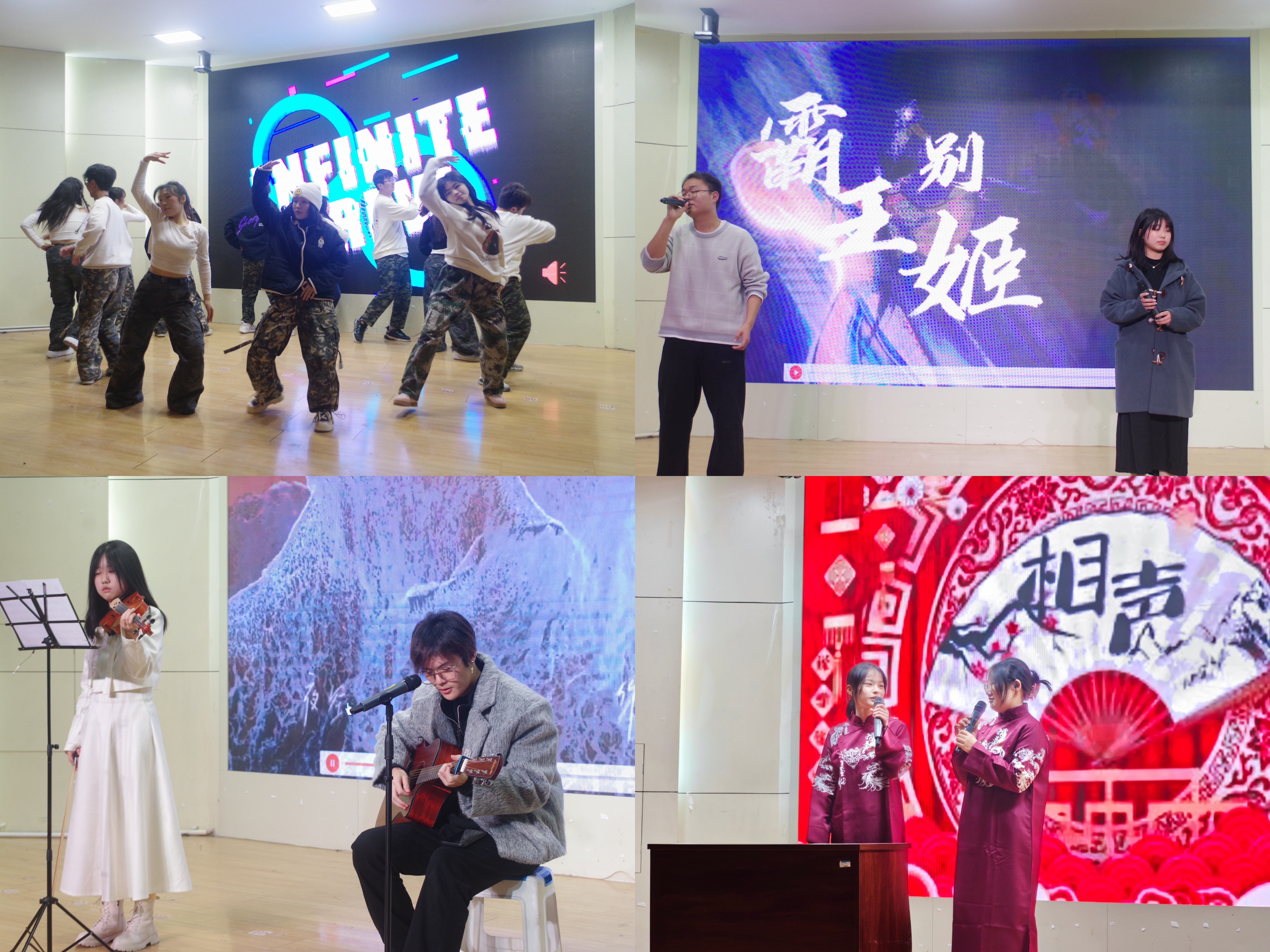 晚会在舞蹈《salty and sweet》中拉开序幕,瞬间点燃现场的氛围;语言类节目《谈相声》妙语连珠,逗得观众们捧腹大笑;爱乐社歌曲《凝眸》悠扬婉转,令人陶醉;校十佳歌手带来的《旅行中忘记》更是将现场气氛推向了一个小高潮;朗诵节目《何以华夏,何以中国》声情并茂,表达了对祖国的深深热爱,唤起了现场观众的民族自豪感。歌曲合唱《你,好不好》温柔纯粹;无限舞团表演的节目充满了青春的力量和激情,舞者们炫酷的舞步赢得阵阵掌声;乐器演奏节目《十二月的奇迹》,用悠扬的旋律为观众们带来了一场听觉的享受;最后,晚会在融合了京剧元素和现代音乐风格的《霸王别姬》中落下帷幕,强大的舞台表现力令人印象深刻。