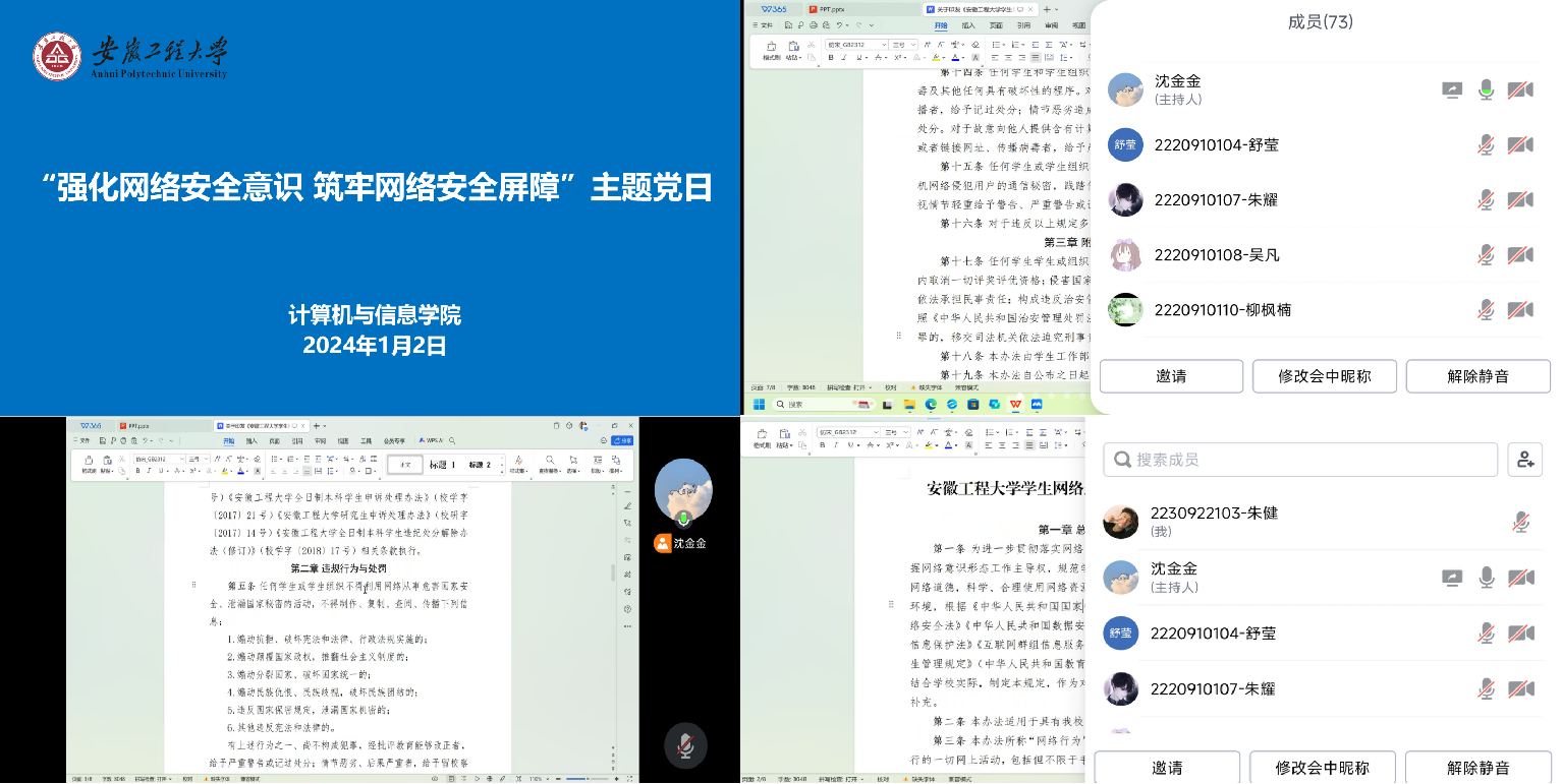 为进一步贯彻落实网络意识形态工作责任制,牢牢把握网络意识形态工作主导权,1月2日,计算机与信息学院组织全体研究生开展“强化网络安全意识 筑牢网络安全屏障”主题党日活动。本次活动旨在提升研究生们的网络安全意识,增强网络安全防护能力。