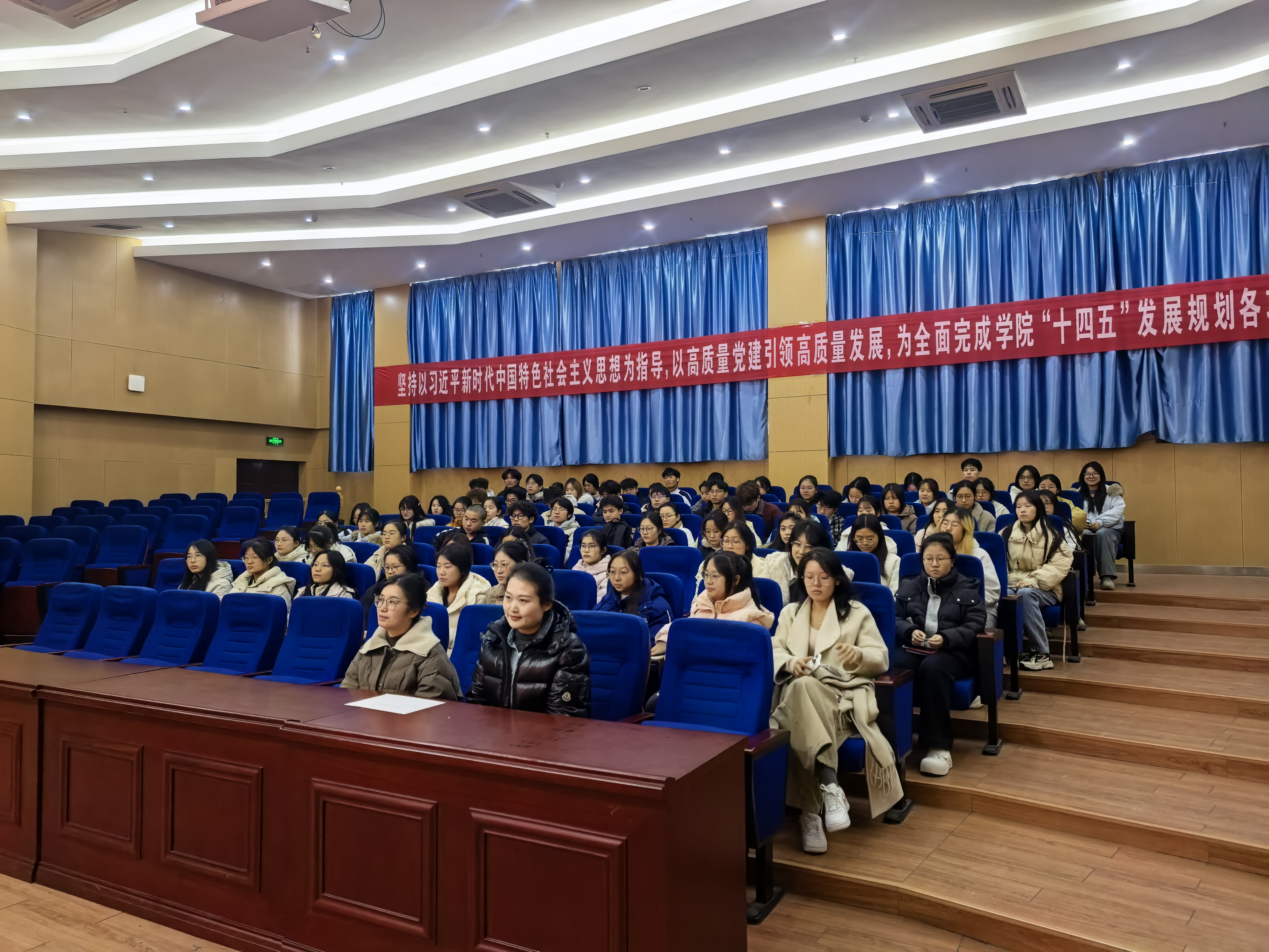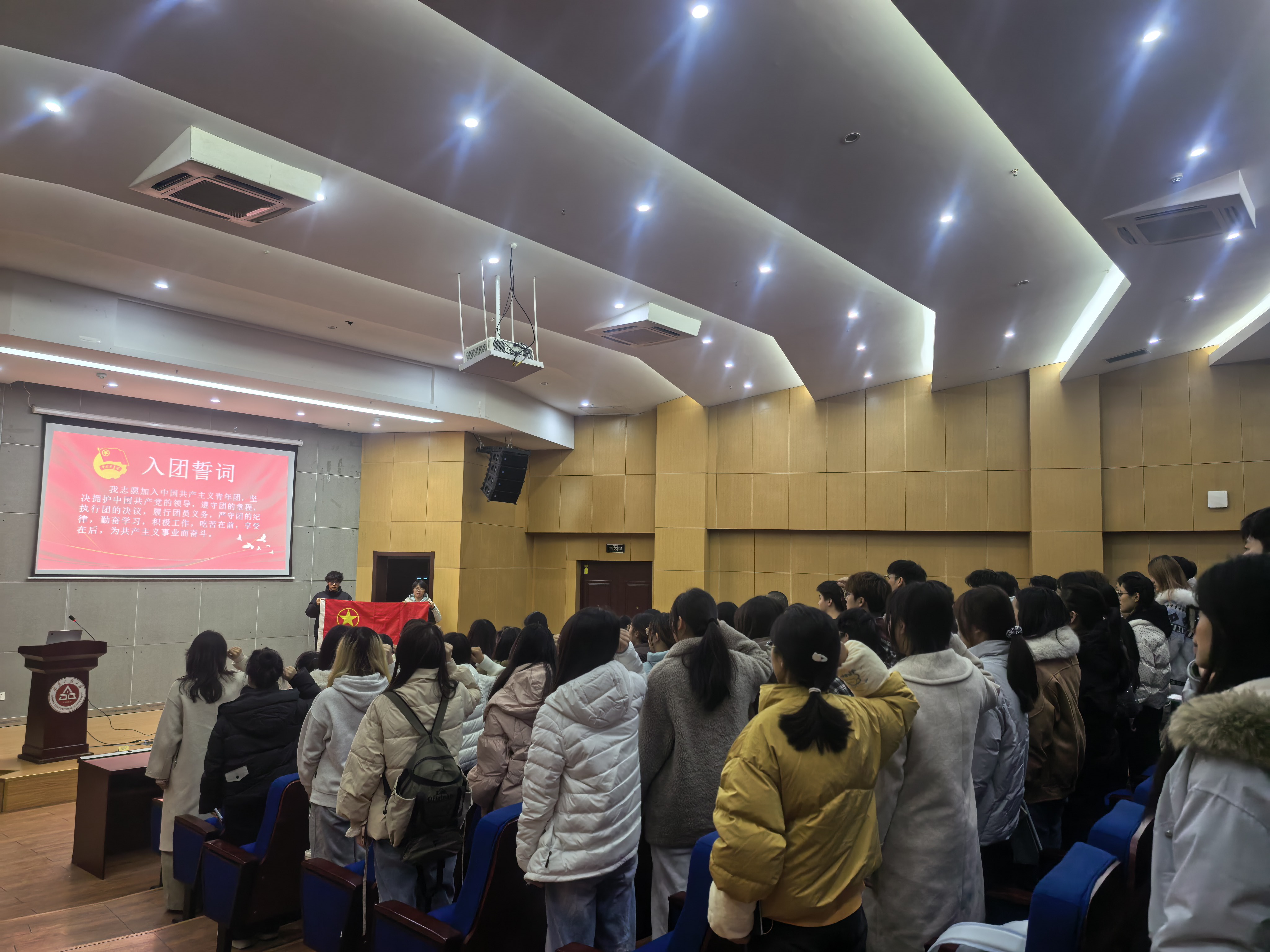 12月18日,计算机与信息学院在C座五楼报告厅举行新发展团员入团仪式,学院团委书记孙力力、辅导员周荣凤和王诣霏,以及80余名2025年新发展团员参加活动。