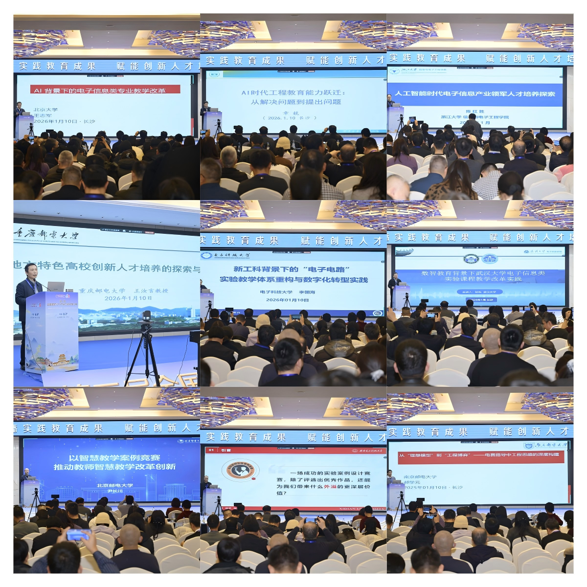 主论坛上,北京大学王志军教授基于北京大学信息科学技术学院的人工智能赋能教学改革与实践,系统介绍了如何有效使用AI辅助教学、如何建设人工智能通识课程以及如何在课程内容中融入AI元素等内容。东南大学胡仁杰教授以“项目驱动、需以致学、学以致用”为宗旨,介绍了通过体系重构破解知识壁垒、从大工程观构建系统工程项目链强化实践育人、以数智赋能变革教学范式,建设项目式“电子电路及系统”课程的思路、方法与实践。湖南大学章兢教授介绍了AI时代下工程教育能力的跃迁,聚焦于从传统的问题解决能力向提出创新性问题能力的转变,他指出解决问题能力的基础为STEM+C,提出问题能力的前提是批判性思维。浙江大学陈红胜教授介绍了浙大信息与电子工程学院在AI时代宽口径、多元化电子信息人才培养方面的一些实践,重点探讨了打造突破学科知识壁垒的个性发展培养体系和创新AI交叉多元化人才培养模式。重庆邮电大学王汝言教授介绍了重邮电子信息类专业在面对大数据、人工智能、B5G/6G等新技术新业态逐渐成为新的增长点,如何主动面向科技变革的新趋势和新要求,如何服务国家和区域经济发展战略需求,如何解决电子信息类专业创新人才培养改革建设体系化不强、课程体系融合不够、产学研创发展不协调等创新人才培养工作中的现实问题,不断推进电子信息类专业创新人才培养的探索与实践。电子科技大学李朝海教授围绕项目式实验教学改革,系统阐述了实验教学体系重构路径与内涵,同时结合数字化资源与数字化实验室建设,探讨如何利用数字技术改革实验教学模式与实验教学评价,推动教育数字化转型。武汉大学邹炼教授介绍了构建“通识+赋能+应用+专业”多元课程体系及“分类+梯度”模块化教学模式,以P-MASE研究型教学模型为核心,融入人工智能等前沿知识,引入文献阅读、Github、超算训练、边缘计算等工具,设计了图像去雾、二维码检测等工程导向信号类实验教学案例。北京邮电大学尹长川教授介绍了智慧教学案例竞赛的组织经验,分享了参赛要求和竞赛内容,以及各赛道的评价指标,并预告了本年度竞赛的组织安排。西安电子科技大学刘乃安教授基于全国高校电子信息类专业课程实验教学案例设计竞赛的典型案例,系统揭示了实验教学设计的深层逻辑,为实验教学从孤立项目走向体系化建设提供了可操作的行动指南。南京邮电大学郝学元教授以全国大学生电子设计竞赛为切入点,探讨如何通过竞赛培养学生的工程化思维,并分享了南邮电赛教育的实施过程与取得的突出成果。这些高水平的报告为电子信息实践教育描绘了清晰的发展蓝图,指明了改革方向。