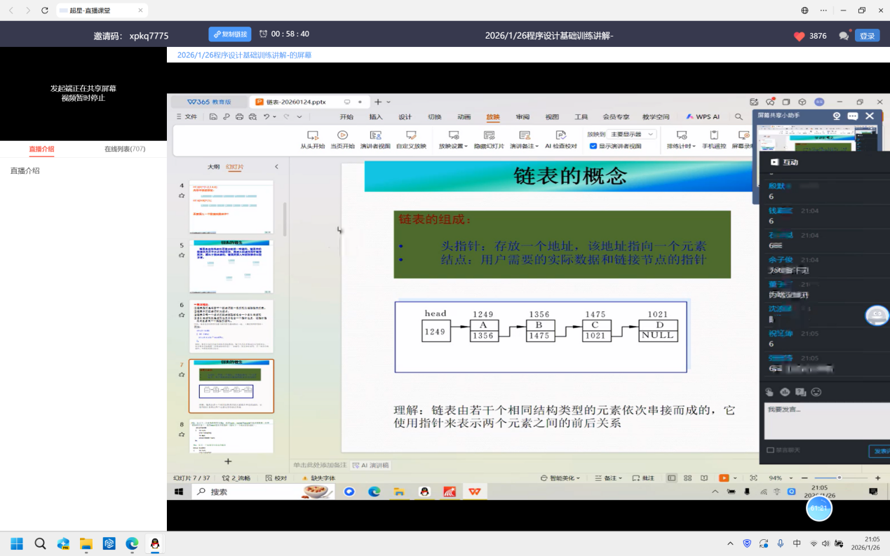 1月26日晚8点50分,课程组开展第二次专题教学,由伊芸芸老师通过学习通直播平台讲授链表相关知识及其应用。伊老师结合具体场景解析链表的构建与使用方法,引导学生理解语法知识与实际问题之间的关联。课堂上互动频繁,讨论热烈,通过“讲—学—问—答”进一步巩固了基础知识,提升了算法设计能力。