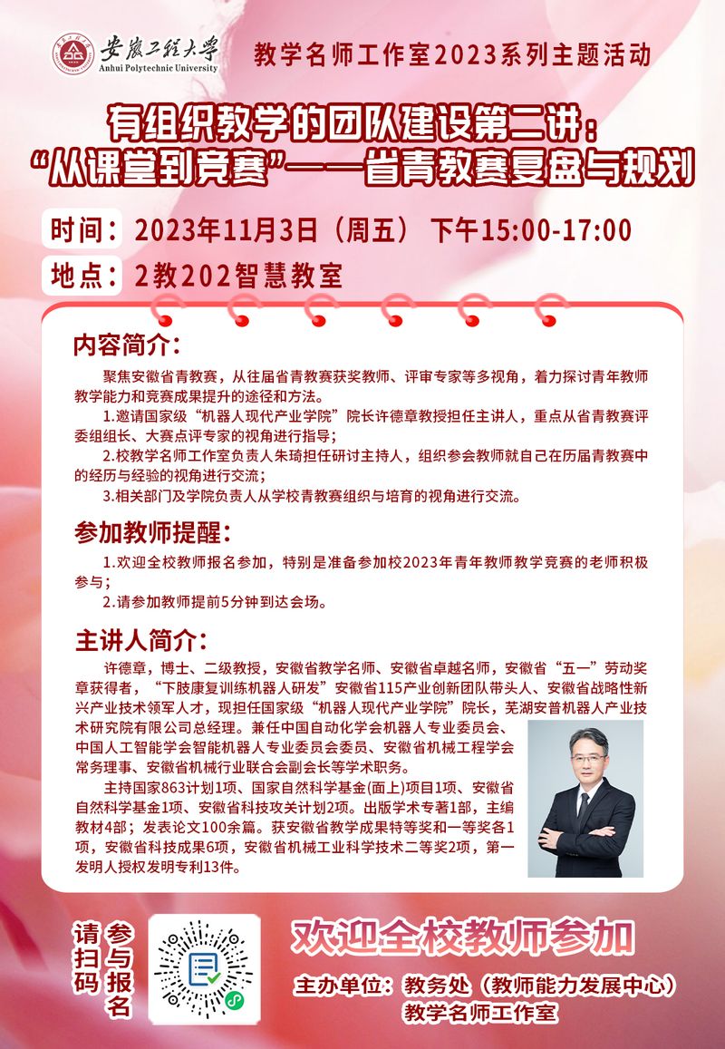 有组织教学的团队建设第二讲暨第四期教学名师工作室主题活动预告---《“从课堂到竞赛”——省青教赛复盘与规划》
