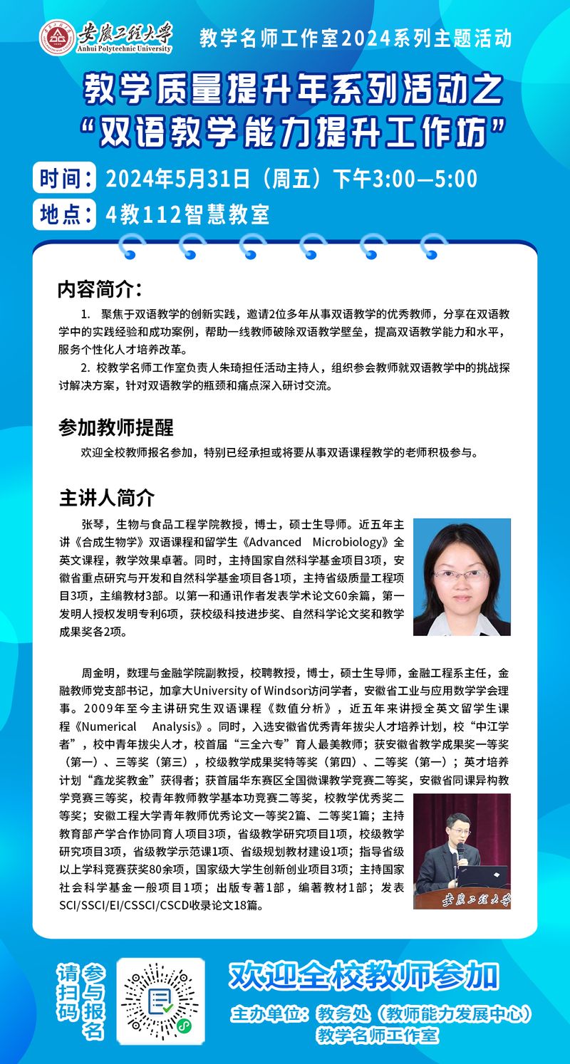 教学名师工作室2024系列主题活动预告---教学质量提升年系列活动之“双语教学能力提升工作坊”