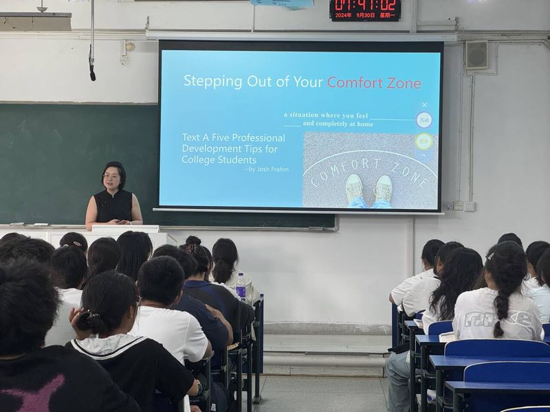 丁阳老师以Stepping Out of the Comfort Zone为主题,针对教学对象为大一新生的特点,循循善诱、层层推进,在讲解语言和写作技巧的同时,引导学生进行批判性反思。教师语音纯正,语调悦耳,举止端庄、教态自然,能时刻关注学生的课堂反应,并及时做出调整和回应。教学设计中既有技术赋能又融入了课程思政,学生的知识、能力、素养在语言欣赏和训练中均得到了提升。丁老师引用习近平总书记的话语鼓励新时代的年轻人主动面对困难、挑战自我,磨砺意志,主题得到了升华。同学们都反映收获满满,授课受到一致好评。