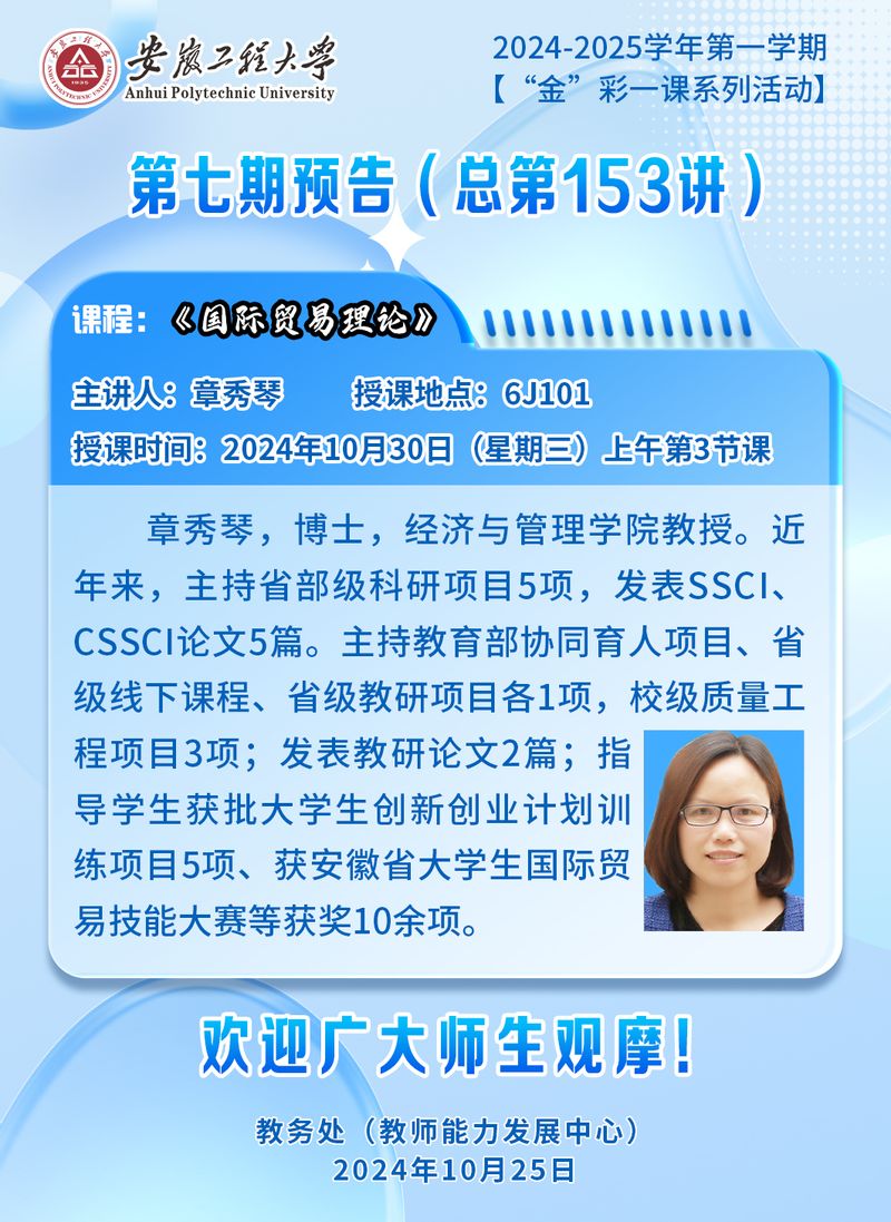 2024-2025学年第一学期【“金”彩一课系列活动】第七期预告(总第153讲)