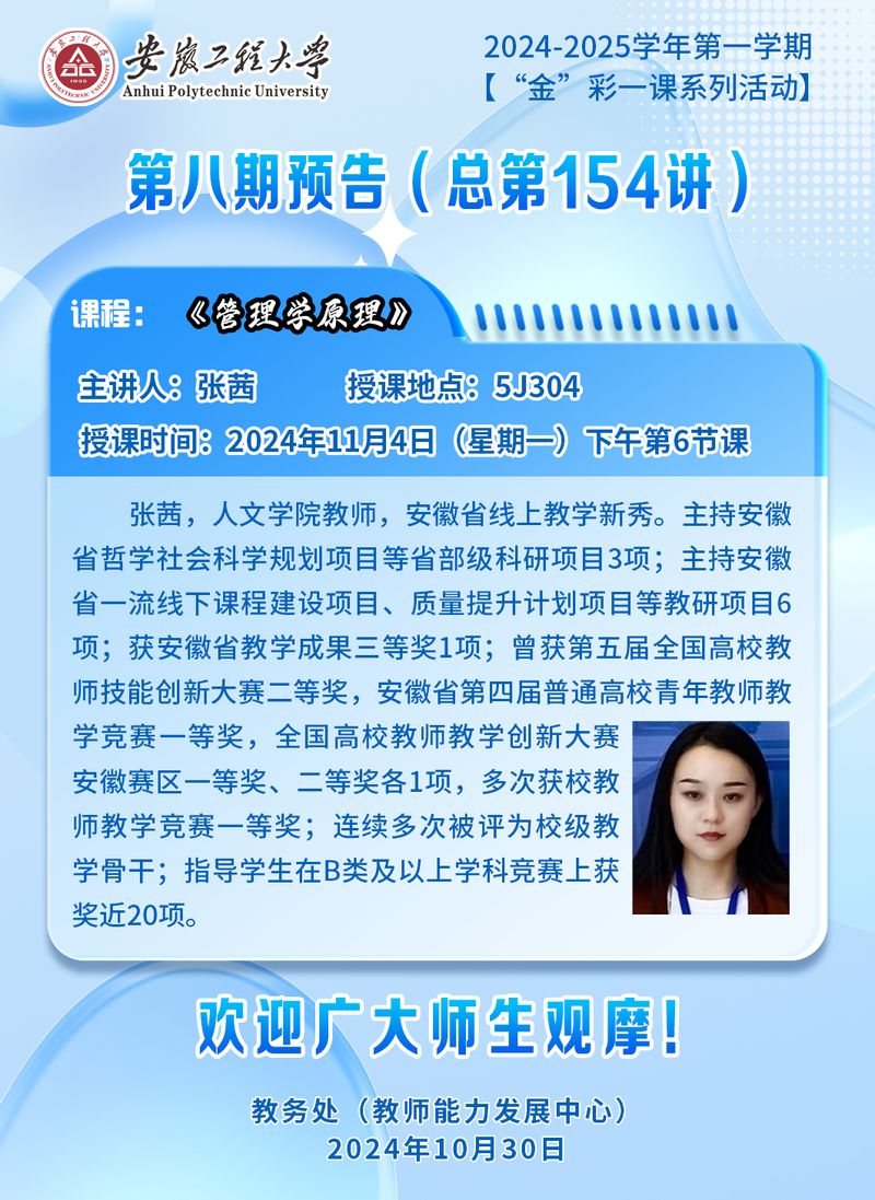 2024-2025学年第一学期【“金”彩一课系列活动】第八期预告(总第154讲)