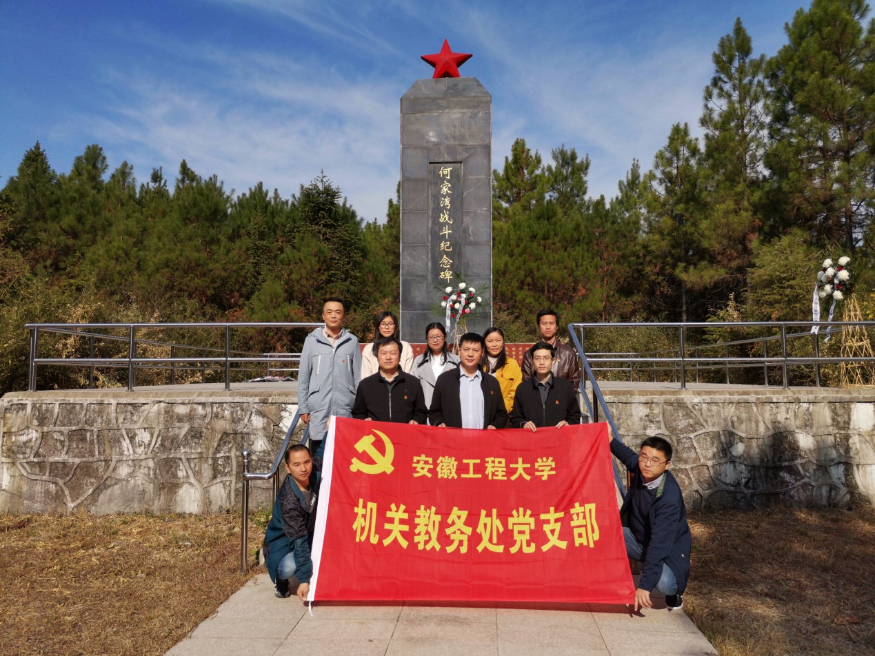 深入开展“不忘初心 牢记使命”主题党日活动,11月16日,教务处领导班子成员及其他党员前往南陵县何家湾战斗纪念碑,开展革命传统教育,缅怀革命先烈,牢记使命担当,激发教书育人与服务管理热情。在何家湾战斗纪念碑前,党员们怀着崇敬的心情向革命先烈三鞠躬致意、敬献花篮。何家湾战斗发生在1940年4月26日,日军3000余人分三路向何家湾“扫荡”。新四军于上午9时开始浴血奋战至黄昏,最终以日军不支,向青阳木镇方向撤退而结束战斗。此次战斗历时9小时,毙伤日军300余人。