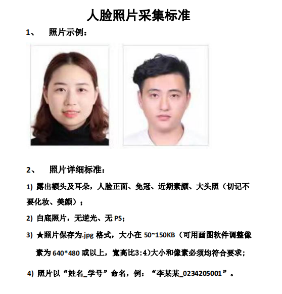 根据学校安排,校园门禁系统采用面部识别的方式予以通行,为保证大家能够正常出入,现收集人脸信息,请同学们按要求提供。若因未提供电子照片或电子照片不符合要求无法进入校园参加教学活动的,按旷课处理。