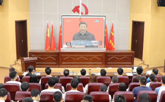 会上,全体师生集体观看了《习近平在北京大学师生座谈会上的讲话》新闻视频,共同聆听了习近平总书记对青年学子的殷切希望:“我衷心希望每一个青年都成为社会主义建设者和接班人,不辱时代使命,不负人民期望。忠于祖国,忠于人民,立鸿鹄志,做奋斗者,求真学问,练真本领,知行合一,做实干家。”话语亲切朴实,催人奋进,现场不时响起热烈的掌声。
