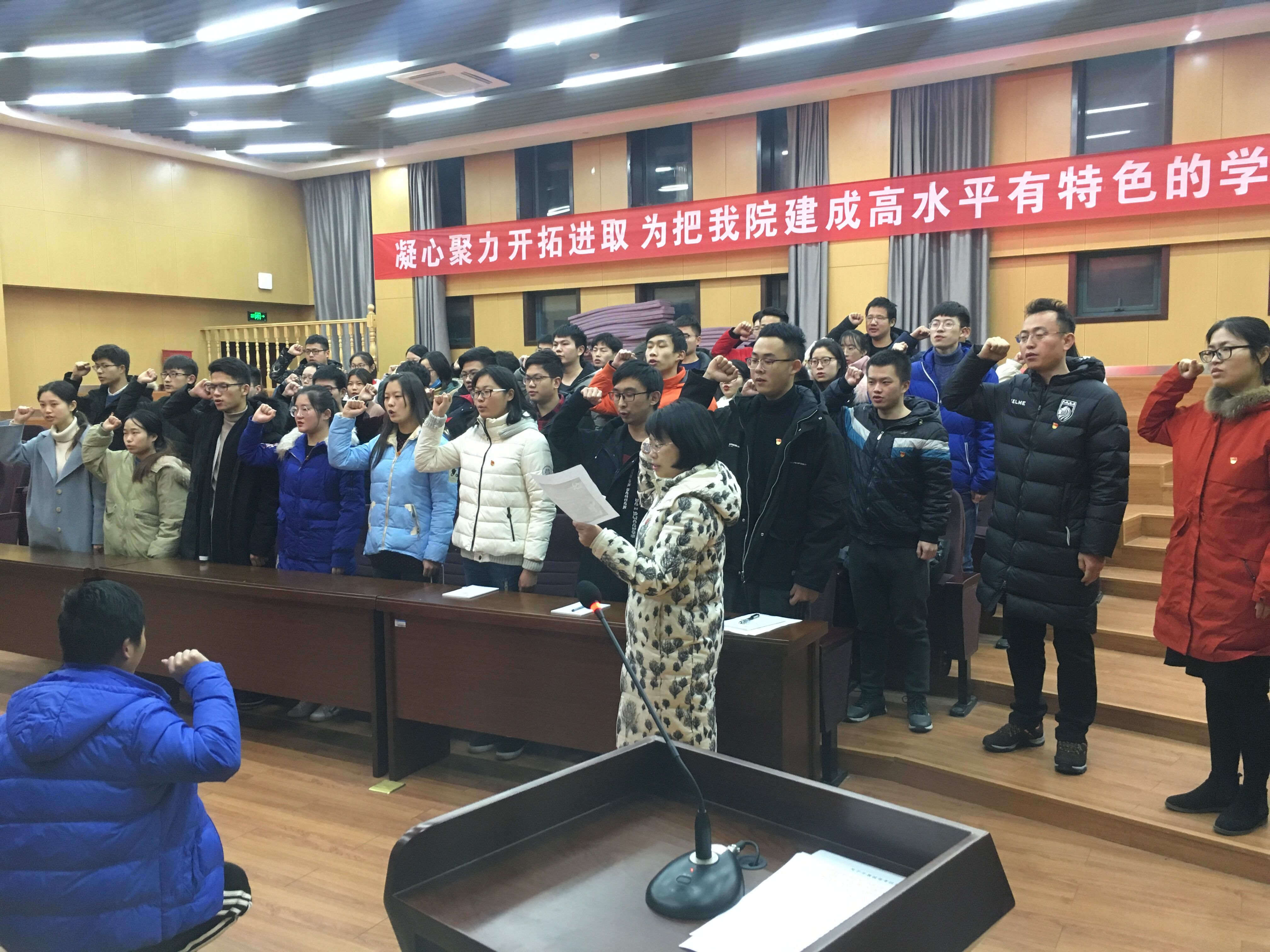 1月8日下午,建筑工程学院2018年59名新发展学生党员入党宣誓大会在学院三楼报告厅举行,各学生党支部书记参加大会,大会由学院团委副书记苏伟刚主持。
