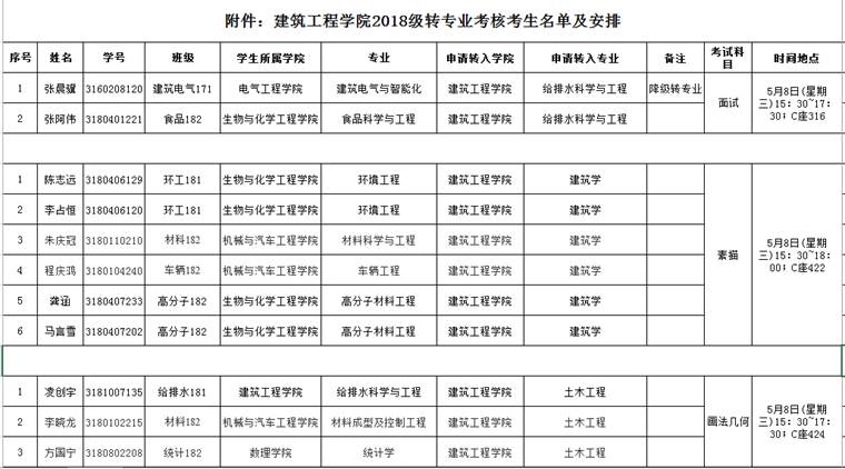 3.建筑工程学院2018级转专业考核考生名单,如下表所示。