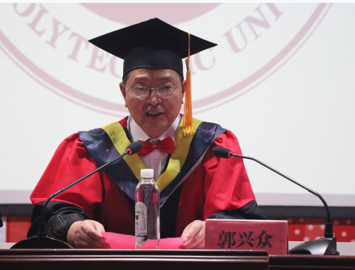 典礼在庄严的国歌声中开始。郭兴众在典礼上发表了热情洋溢的致辞。他首先向圆满完成学业的毕业生表示最真诚、最热烈的祝贺,对辛勤工作、无私奉献的老师们致以最诚挚的敬意,为到场的学生家长表示敬意和自豪。他饱含深情地说,四年里,你们耕耘理想、追求真理、刻苦学习、勤于实践,收获了扎实的专业知识、创新的建筑理念、辩证理性的思维习惯。四年里,你们在学习科研、志愿服务、义务支教、对外交流,以及各类竞赛活动中为学校、学院争得了众多荣誉,建工学子的拼搏精神,已成为一道亮丽的风景线定格在校园。在建筑工程学院这个年轻而充满活力的大家庭中,既有“土”的踏实和厚重,也有“木”的挺拔与秀丽,既有“水”的活力与灵动,又有“管理”的睿智与创新。