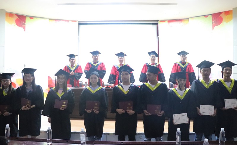 院长徐达奇宣读了授予2019届本科毕业生学士学位的决定,主席台就座的领导逐一为全体毕业生颁发证书、扶正流苏、合影留念。
