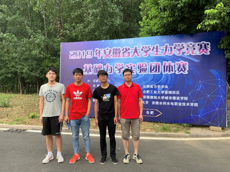 7月16日,2019年安徽省大学生力学竞赛基础力学实验团体赛在合肥工业大学翡翠湖校区举行,共有10所院校组建的10个团队参赛。成绩当日揭晓,我校参赛团队位列第四,荣获团体二等奖;廖斌老师荣获优秀指导教师奖。