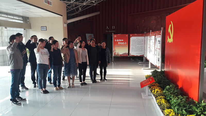 烈士陵园内翠柏森森,英魂凛凛。全体党员干部首先参观了革命纪念馆内陈列的文献资料和革命图片展,一幅幅反映革命战争年代场景的历史图片,生动地诉说着曾经发生的感人故事。这些珍贵的历史资料使全体党员深刻体会到中国革命成功的不易,深感自身责任重大,使他们在思想认识上再次受到了教育。在革命烈士纪念馆,全体党员干部面对党旗,庄重举起右手,面对党旗重温了入党誓词,缅怀革命先烈。