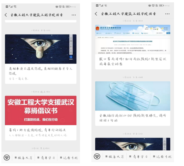 学院每个辅导员对自己所带的学生积极关注,特别是湖北学生,经常性通过网络询问他们的情况,并且通过学院团委微信公众号实时报到湖北学生的生活状况,通过“身边人”对“身边事”的讲述,在给广大学生报平安的同时,扎实做好学生的价值引领工作。