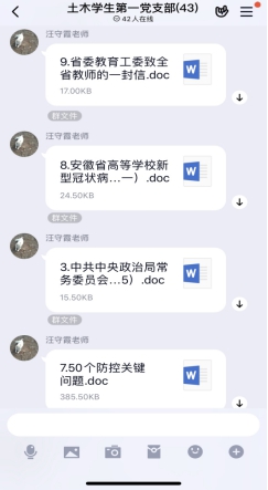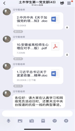 3月以来,疫情防控进入关键阶段,疫情就是命令,防控就是责任。为充分发挥党员的先锋模范作用以及党支部的战斗堡垒作用,激励党员把思想和行动统一到中央、省委决策部署上来,全力以赴投入到防控阻击战中。建筑工程学院土木学生第一党支部于3月25日依托QQ群创新开展以“线上防疫党旗飘”主题党日活动,组织动员党员认真学习国家、省委、学校关于疫情防控的相关文件精神,并畅谈学习心得体会,支部全体党员参加活动。