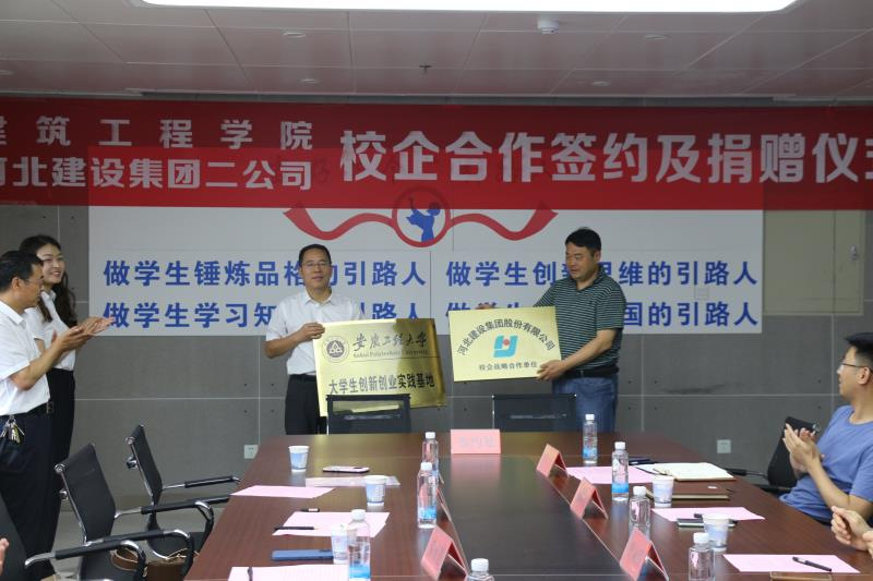 通过深入细致的交流,校企双方签订了合作及捐赠协议。曹安照与乔永进代表双方签订了《RayBetApp官网下载 教育发展基金会接受捐赠协议书》,徐达奇与乔永进代表双方签订了《建筑工程学院与河北建设集团第二分公司校企合作协议书》,张国友与乔永进进行了大学生创新创业基地、校企战略合作单位互认授牌。
