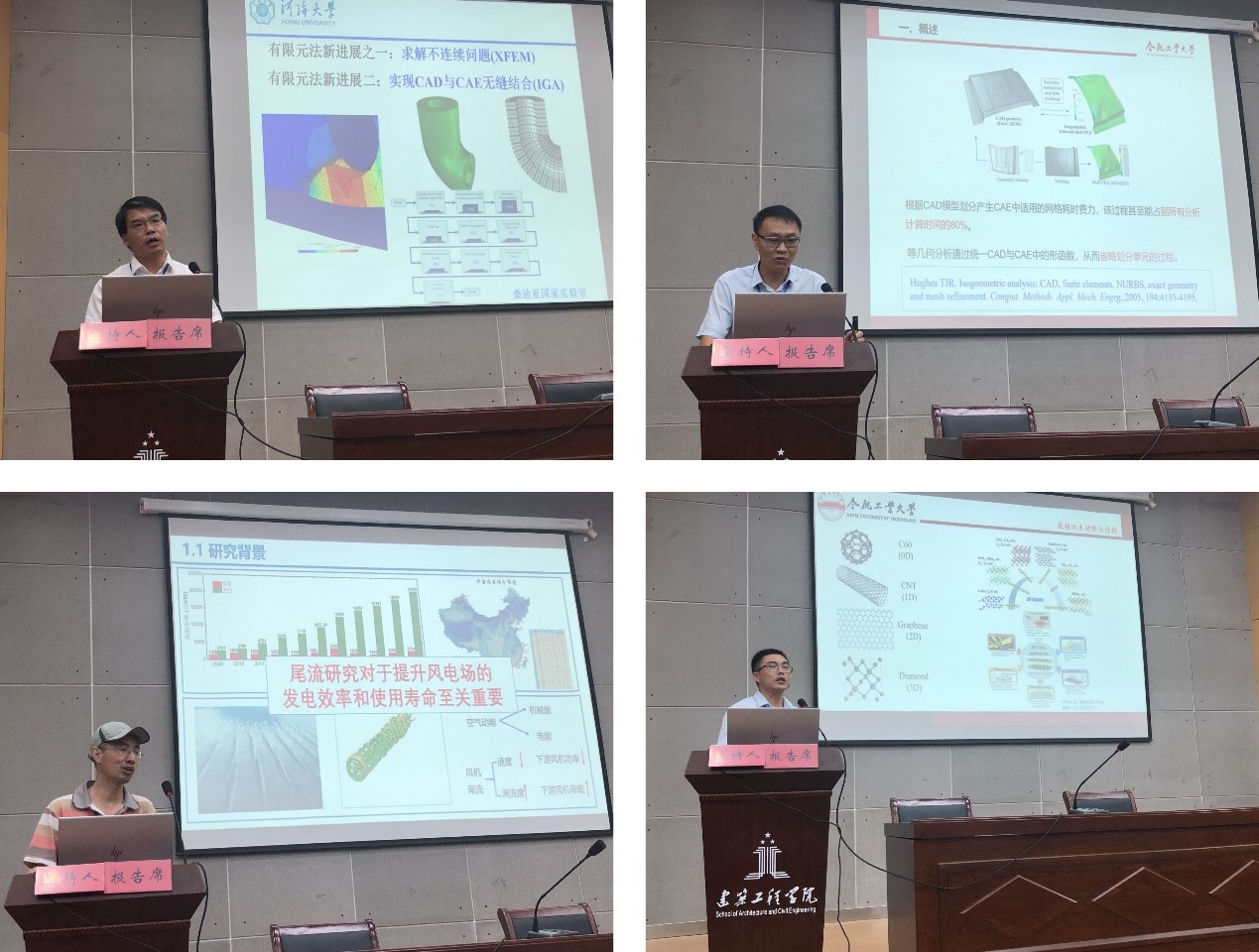 会议主题报告由建筑工程学院力学教学部主任陈善群教授主持。四位专家作了特邀主题报告。河海大学余天堂教授以《扩展有限单元法及应用》为题介绍了扩展有限单元法的提出、基本原理以及课题组对该方法做出的完善和在工程中的应用;合肥工业大学程长征教授以《等几何边界元法中双重奇异性研究》为题介绍了等几何边界元法的建立、切口尖端奇异强度分析和工程应用;河海大学信志强副教授以《多流体尾流数值模拟及尾流模型开发研究》为题介绍了风力场中多风机尾流模型开发和数值模拟;合肥工业大学李孝宝研究员以《低维纳米材料中力-电-扩散耦合原子模拟研究》为题介绍了TMD纳米带力-电耦合性质和应变梯度对锂离子扩散性质的调控。各位专家在报告后,与在座工程技术人员、老师和同学们针对学术问题做了深入的探讨和交流。