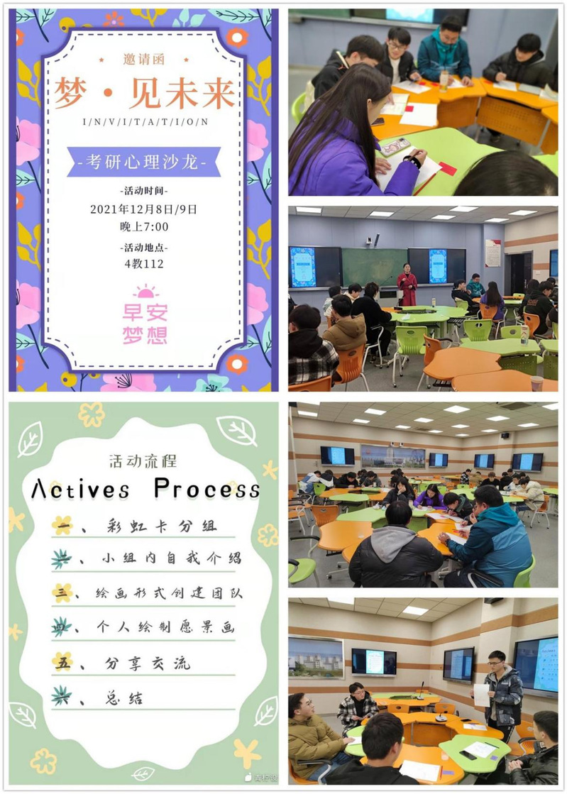 12月8日晚,毕业班辅导员赵恒芳在4教112开展考研心理绘画沙龙活动。她利用积极心理学理念下的心理疗愈卡七色彩虹卡进行分组,让每个人画一样可以代表自己的事物进行自我介绍,很多同学通过画面宣泄了自己的情绪,介绍了自己目前临近考研的压力状态。接着,让大家绘制考上研究生之后的愿景画,让大家在畅想未来生活的同时进行积极的心理暗示。随后进行分享交流,大家都展示了自己的考研愿景图,并且具体描述了自己向往的生活。在最后的总结阶段,赵恒芳说:“开展这个主题活动希望可以鼓励大家,坚定考研信心,同时让大家回去后做一个思考,达成考研之后的这个生活或者状态,中间有哪一些部分实际上和这个考研本身无关,是我们随时或者在任何情景下都可以去追求的。希望大家在最后的时间里,可以通过活动得到启发,调整好自己的状态,从容应考。”