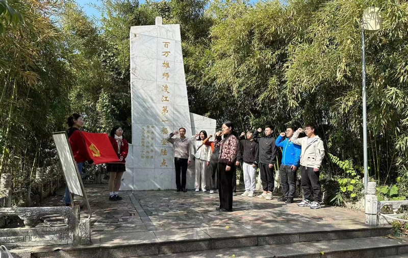 全体成员首先来到渡江广场,参观“渡江战役第一船登陆点”纪念碑,感受渡江成功后的胜利喜悦。随后,在渡江第一船展览馆中,追寻红色记忆,重温革命历史,渡江前的准备工作、渡江中的艰难险阻等详细的文字描述、图片展示、实物展品,展现了一场生动而又壮丽的历史。同时,在此期间产生了众多的渡江英雄,他们浴血奋战的光辉事迹依然熠熠生辉。渡江战役成功的背后是所有解放军的默契配合,是靠解放军和老百姓们一浆一浆划出来的。全体成员深刻地体会到1949年4月29日人民解放军渡江时“不畏艰险、勇于拼搏、终得胜利”的精神。在百万雄师渡江第一船登陆点纪念碑旁举行了庄严的重温了入党誓词仪式,铿锵有力的誓词彰显了全体党员的初心和使命。