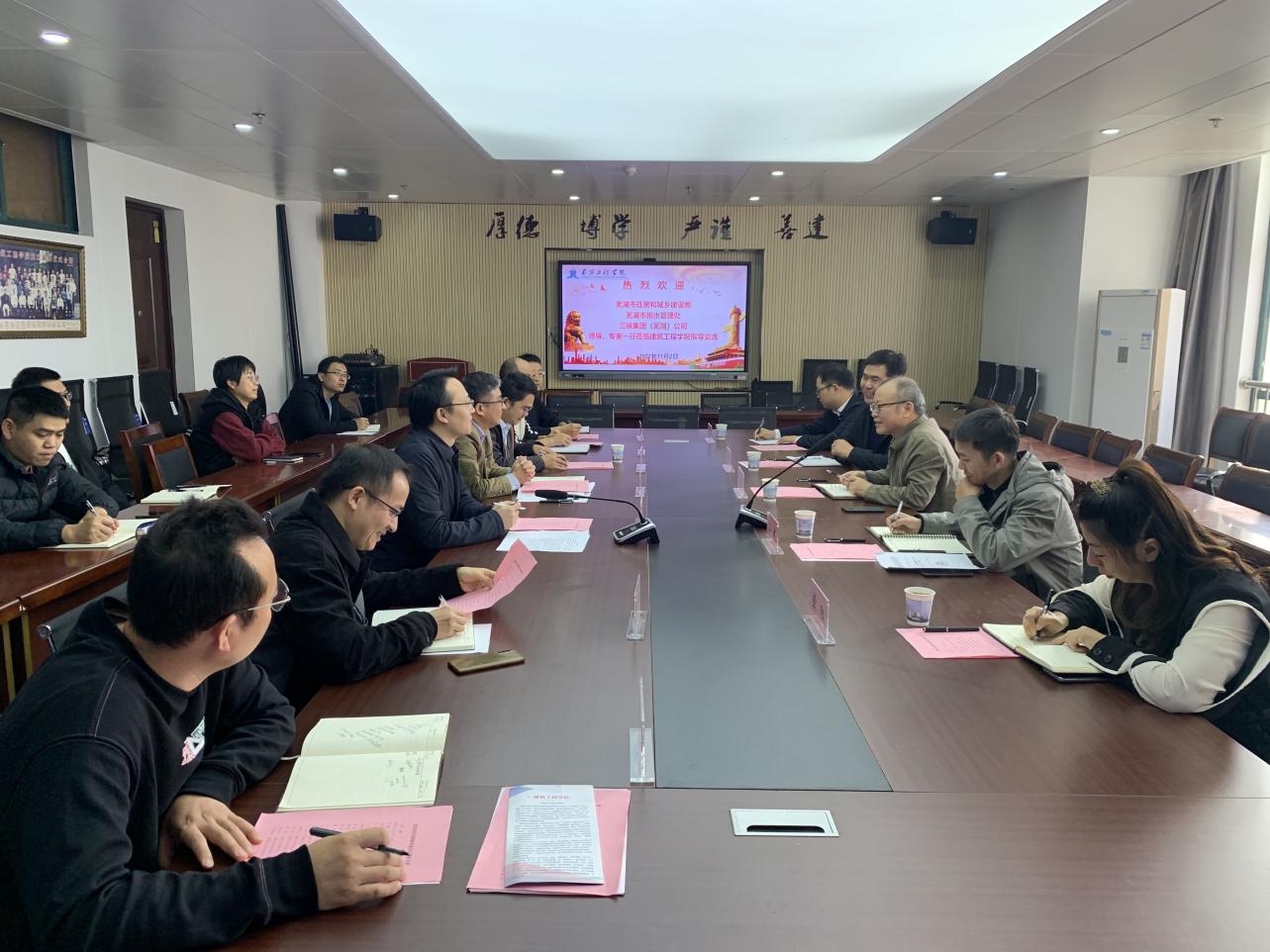 王刚从历史沿革、内涵建设和社会责任感三个维度介绍了学校科学研究的基本情况,建议可从人才共享、项目对接等方面开展校地双方合作,表示作为科研职能部门全力支持学院与地方管理部门的深度合作。张明介绍了市政工程系的基本情况和发展历程,期待在芜湖市海绵城市建设等方面积极发挥作用。在交流研讨环节,双方就大学生实习实践基地建设、人才岗位互聘、研究生联合培养、开展技术对接、科研项目申报、党建共建等方面合作进行了深入地沟通交流。