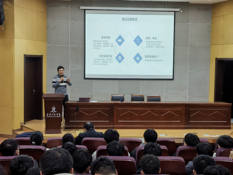 第三阶段,各专业教师主动与同学们交流,提供调剂院校参考信息。付晓惠老师提醒同学们要关注复试考察形式和内容,韩有民老师提醒同学们做好自我介绍环节的准备工作。毕业班辅导员也向同学们询问复试的场地需求情况,表示会积极安排好后勤工作,让同学们无后顾之忧。最后,老师们就考研同学提出的复试与调剂的相关问题作出详细解答。