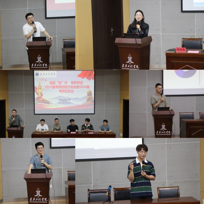 会议后半段,2023届5位考取研究生代表进行经验交流分享。土木193彭仕宇考取哈尔滨工程大学,重点分享了自己在复试时如何“逆风翻盘”调剂到211高校的实战经验。工程192龚政同学考取辽宁工程技术大学,分享了自己初试复习进程,以及如何选择考研和考研形势的研判。建筑182李苏安同学考取西安建筑科技大学,重点分享了自己在专业课学习方面的经验和做法。土木192周勇同学考取南京航空航天大学,重点分享了自己考研的感悟,以及对高数学习过程进行了详细讲解。给排水191张自宏同学考取河海大学,重点分享了自己跨考专业、择校及复试方面的经验。