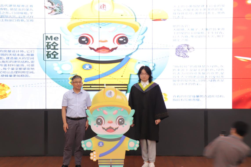 慈龙玏同学代表全体毕业生向学院捐赠自主设计的吉祥物“Me 砼砼”,学院党委书记李烨代表学院接收捐赠。“Me砼砼”原型来源于鸱尾、蜜蜂,名字取蜜蜂的谐音Me,“砼”心“铸”魂的砼,寓意“我的砼”“我们的砼砼”“大家的砼砼”。