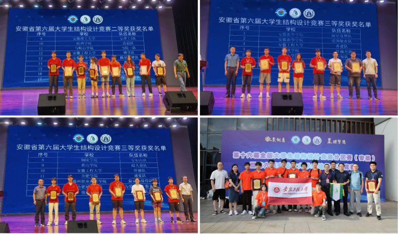 7月3日至7月6日,第十六届全国大学生结构设计竞赛分区赛(安徽)暨第六届安徽省大学生结构设计竞赛在黄山市黄山学院举行。由我校推选的三支队伍参加赛事并取得二等奖1项,三等奖2项的优秀成绩。建筑工程学院院长曾磊担任赛事专家评委,副院长张金轮和土木工程系专业教师等参与学生竞赛指导和赛事考察。我校将承办下一届安徽省大学生结构设计竞赛。