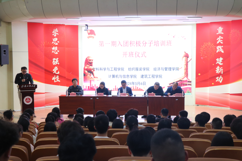 为落实全面从严治团要求,规范发展团员工作,提高发展团员质量,保持和增强团员队伍先进性,5月6日,在学术报告厅举办学院第一期入团积极分子培训班,本次培训班由材料科学与工程学院、纺织服装学院、经济与管理学院、计算机与信息学院、建筑工程学院联合举办,校团委书记李恒奎、学院党委副书记张礼波、方玖胜、孙德茹、刘海涛受邀出席。参加本次开班典礼的还有各学院团委负责人、培训班班主任以及205名入团积极分子。典礼由苏伟刚主持。
