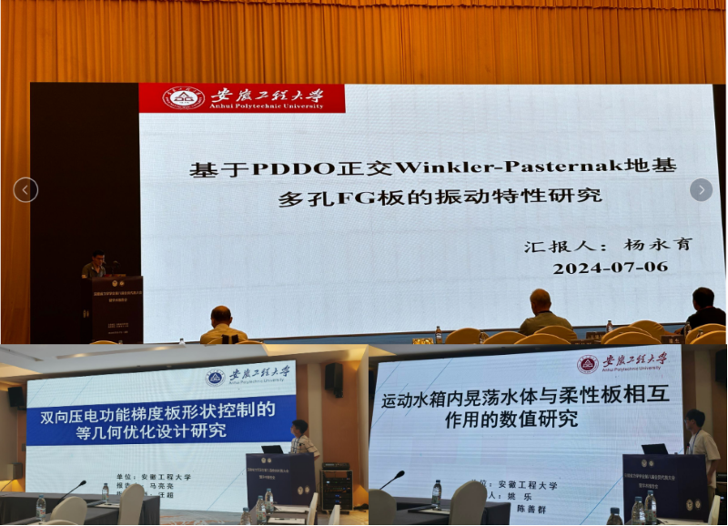 本次会议由安徽省科学技术协会指导,安徽省力学学会主办,安徽理工大学承办。为方便参会学者交流探讨,会议安排了分会场学术报告及交流活动。我院参会师生与同行学者进行了深入交流,重点就力学领域前沿科学和教学相关问题进行了学术交流与探讨。我院教师杨永育做了题为“基于PDDO正交Winkler-Pasternak地基多孔FG板的振动特性研究”的学术报告。此外,我院研究生马亮亮、姚乐分别做了题为“双向压电功能梯度板形状控制的等几何优化设计研究”、“运动水箱内晃荡水体与柔性板相互作用的数值研究”的学术报告,并获得了研究生优秀报告奖。