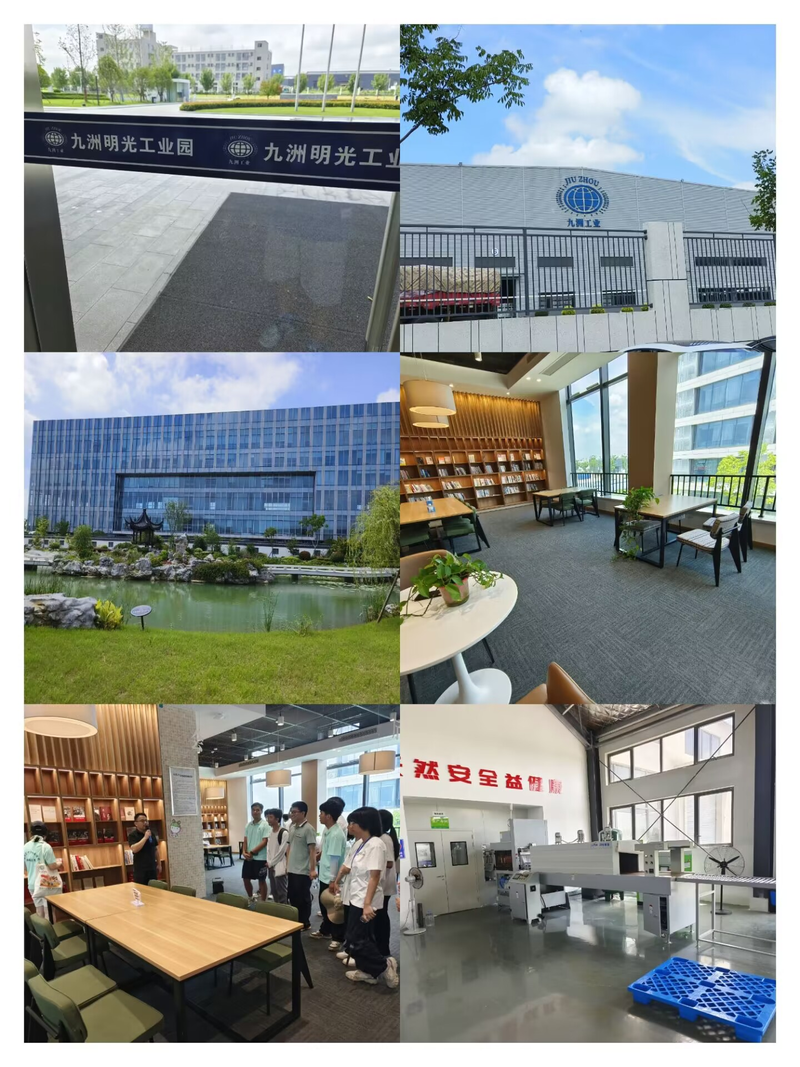 “产业兴邦展宏图,园区探秘寻真理。”最后,先锋队走进了明光九洲工业园。园区内机器轰鸣,生产线高速运转,工人们忙碌而有序。这里是科技创新的摇篮,是产业升级的前沿阵地。队员们与企业负责人交流,与一线工人对话,了解着每一项技术的突破,每一个产品的诞生。在这片充满活力的土地上,大家看到了明光经济发展的强大动力,感受到了“千磨万击还坚劲,任尔东西南北风”的奋进精神。