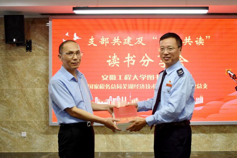 活动过程中,图书馆馆长王忠群和芜湖经开区税务局正处级调研员张华敏举行了图书捐赠仪式,张华敏对图书馆党支部邀请芜湖经开区税务局党总支进行支部共建表示感谢,对各位师生的朗诵和读书分享表示赞赏,他提出希望双方今后可以在党建方面做更多的交流和互动。