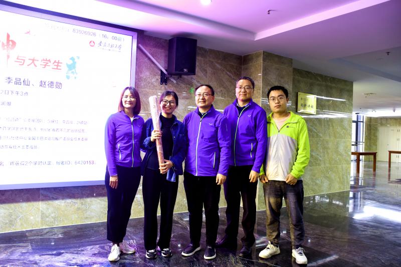 在互动环节,薛老师向我们展示了他从事运动生涯所获得的各类证书奖状和2008年的奥运火炬,这引起同学们极大的兴趣,纷纷合影留念,一起感受“更高、更快、更强、更团结”的奥林匹克体育精神。赵老师还进行了现场抽奖,送出了十几张奥运会明信片,被抽中的同学们满心欢喜。