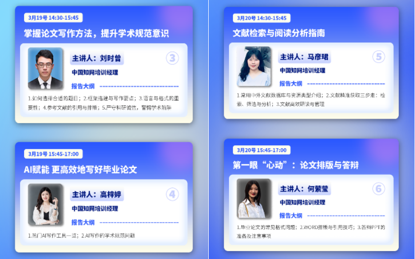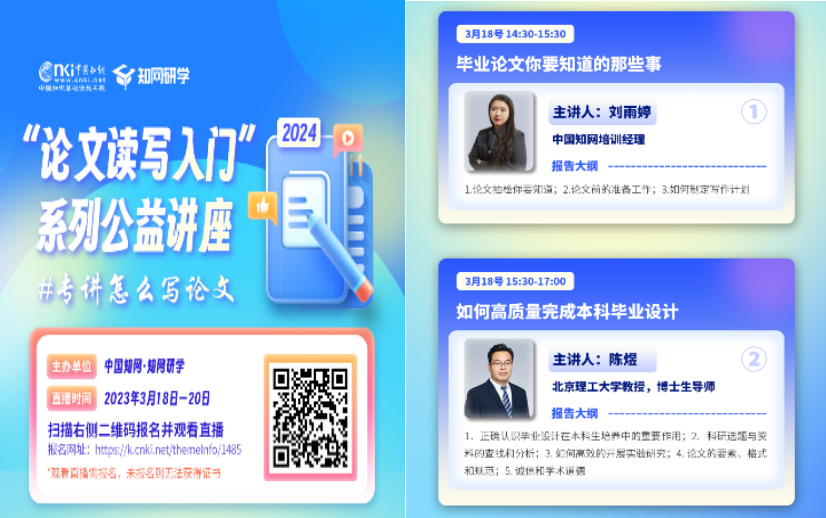 为帮助2024届毕业生提高论文写作效率,加强对论文规范和科研诚信的认识,提高我校本科毕业论文(设计)质量,请大家积极参与中国知网举办的“论文读写入门”系列公益讲座!具体安排如下: