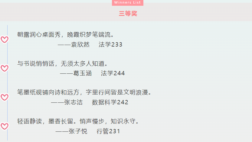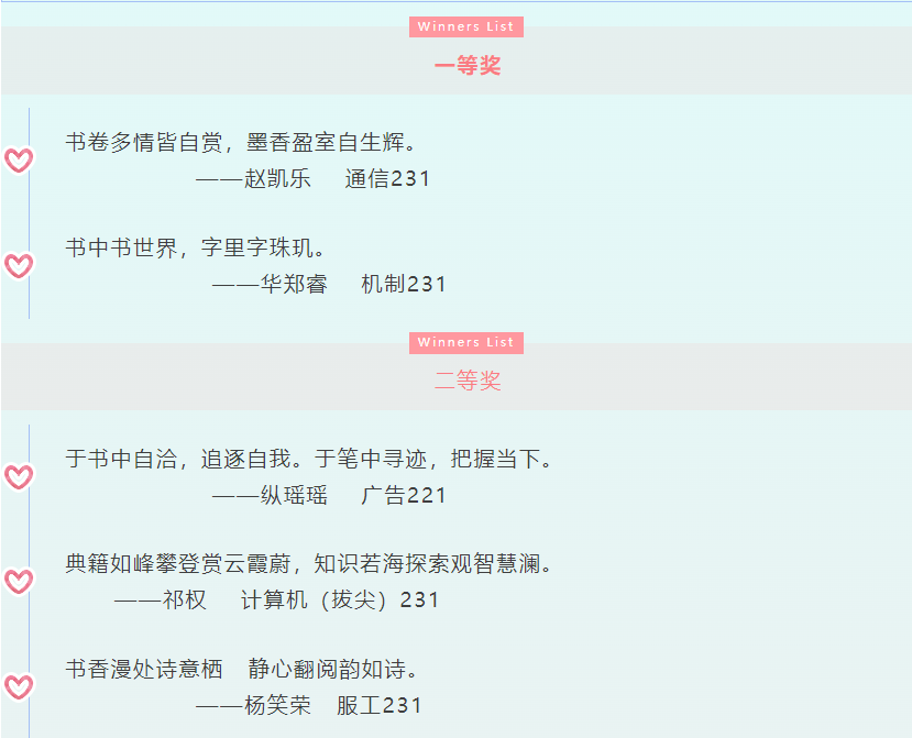 经过图书馆老师与读委会成员的精心评选下,本次桌面提示语比赛的结果已经正式揭晓。通信231的赵凯乐、机制231的华郑睿同学荣获一等奖;广告221的纵瑶瑶、计算机(拔尖)231的祁权、服工231的杨笑荣同学荣获二等奖;法学233的袁欣然、法学244的葛玉涵、数据科学242的张志洁、行管231的张子悦同学荣获三等奖;机制238的戴吉明、电商法242的许钰清等同学荣获优秀奖。他们以独特的视角、创新的思维、富有感染力的表达,传递出对阅读意义的认知、积极阅读的态度和作为大学生应具备的阅读价值观。
