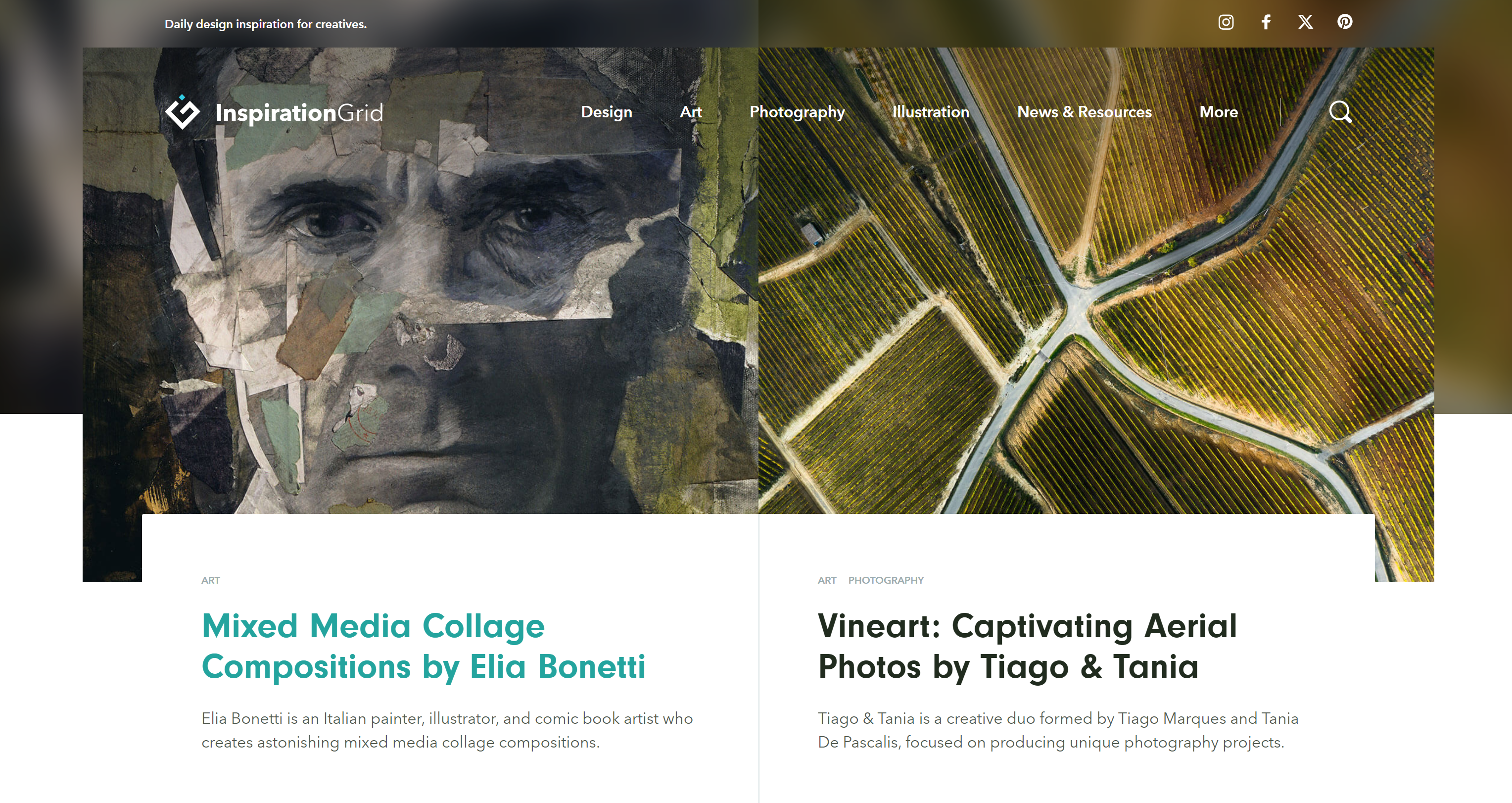 Inspiration Grid 是一家加拿大的创意设计网站。每天更新有关平面设计、艺术、摄影、插图、建筑领域的优秀设计作品,也有各种设计主题的灵感推荐专题。网站非常有活力,呈现的内容都是经过精心挑