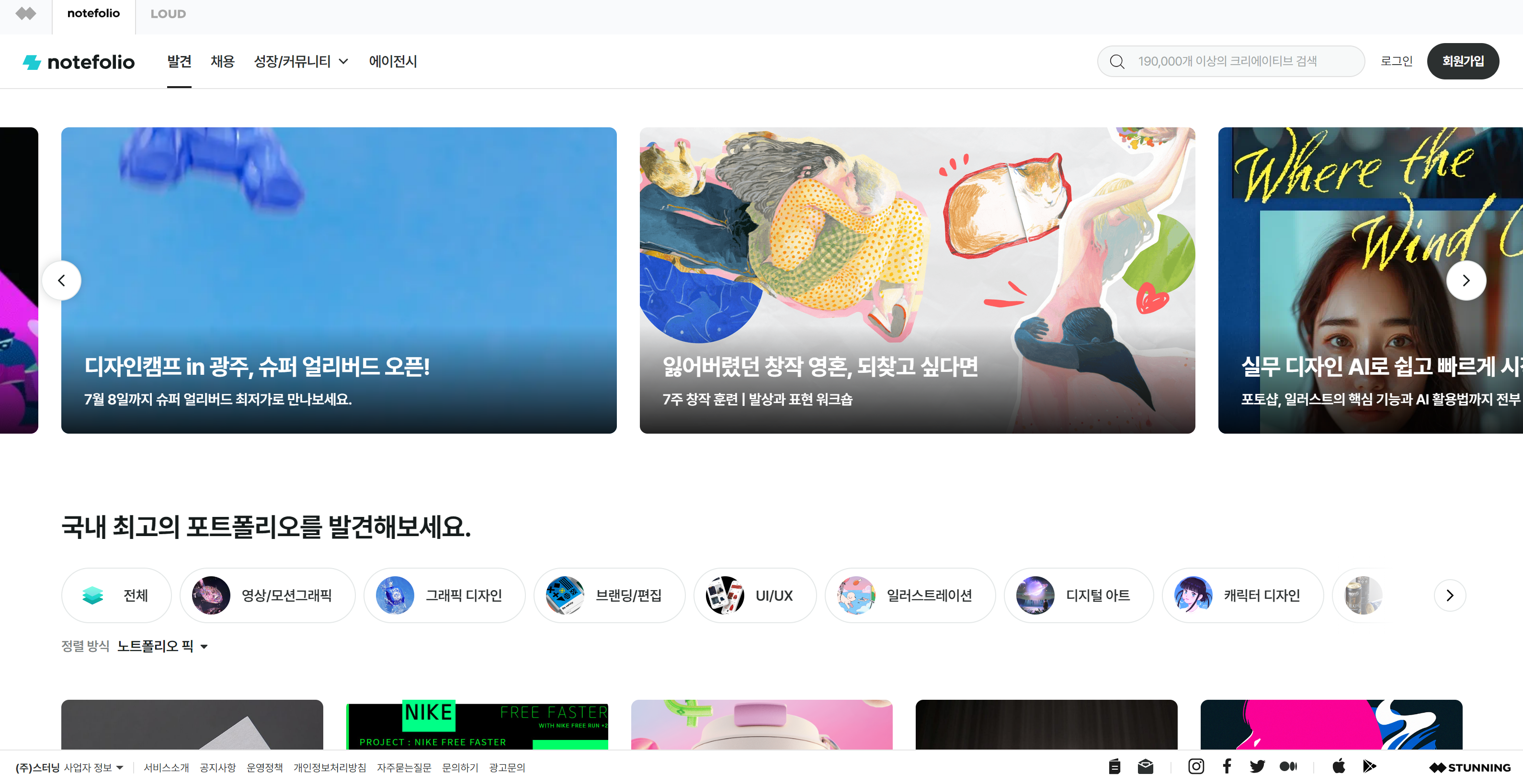 Notefolio 是韩国的一个综合性的设计网站。里面有很多韩国设计师、艺术家发布的优秀作品,涵盖平面设计、3D、UI、插画、产品/包装、时尚、艺术、摄影等多个领域,还有很多专业设计师/插画师分享