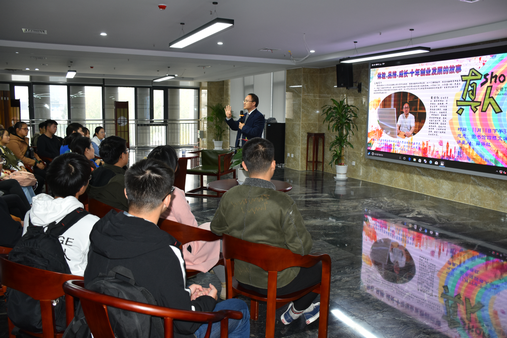 真人show活动是图书馆第十三届读者服务宣传月活动内容之一,也是图书馆的品牌活动。真人show,也称真人图书馆,旨在分享一个理念“我们每个人的经历本身就是一本书”,通过把不同阅历、不同见识的人邀请到一起以一种面对面交流的方式来完成“图书”的阅读。11月14日下午3:00,由图书馆主办,文澜读书社、读者委员会协办的“体验.品格.成长-十年创业发展的故事——真人show”活动在图书馆四楼文澜阁成功举行。此次活动特别邀请到了体育学院的薛保红老师,与同学们进行面对面的交流。活动由图书馆副馆长李琛主持。
